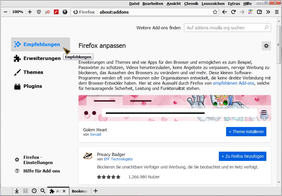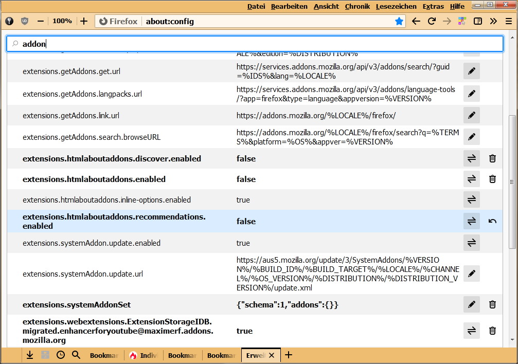 Das altbewährte extensions.htmlaboutaddons.recommendations.enabled auf false bringt keine Änderung mehr.