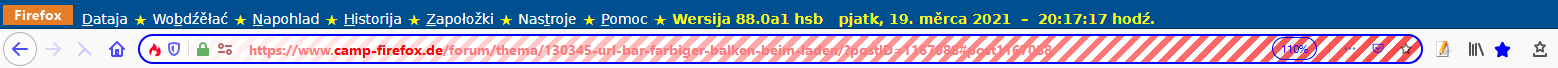 Endor , wenn es so läuft und Du das wieder übernimmst, erwähne auch und vor allem Milupo. Ich habe hier übrigens z-index: -1 gewählt. Und beachten: Ich habe nicht nur innerhalb des CSS-Bereichs etwas geändert, sondern auch in Zeile 33 32, damit das Skript überhaupt auf den Urlbar-Hintergrund angewandt wird. Das Skript habe ich wieder von weiter oben übertragen, kann also sein, dass die Farbangaben wieder geändert werden müssen.