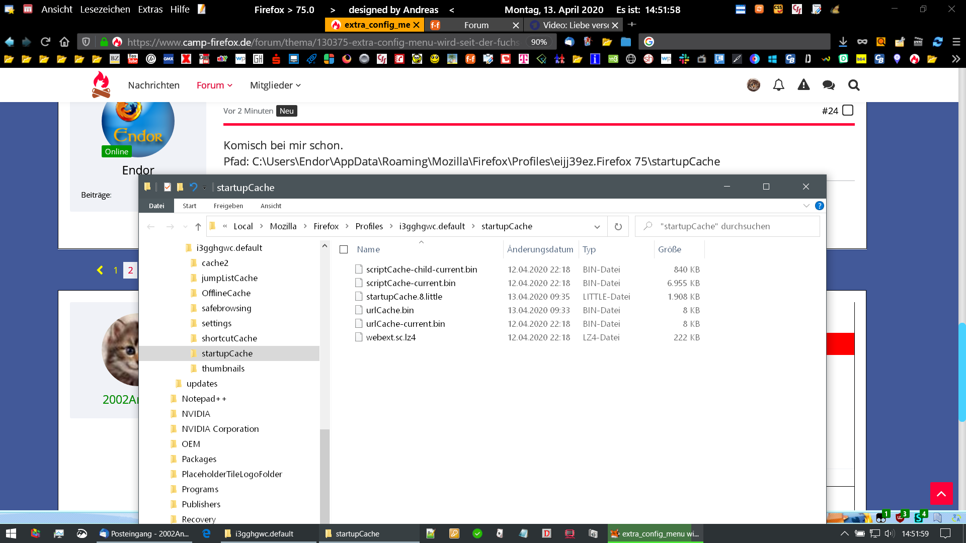 Pfad: C:\Users\Endor\AppData\Roaming\Mozilla\Firefox\Profiles\eijj39ez.Firefox 75\startupCache