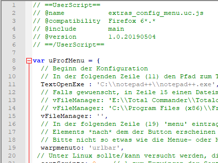 BarbaraZ- Ich glaube, ich habe die Ursache gefunden. Welche Version hast du zuletzt getestet, deine eigene oder die Version von Boersenfeger? Boersenfeger verwendet nämlich back-button für warpmenuto (Zeile 18) - das funktioniert. In deiner Version aus Betrag #1 verwendest du urlbar als Wert für warpmenuto. Aber urlbar, das ursprünglich das Skriptsymbol hinter der Adressleiste einfügte, funktioniert nicht mehr. Stattdessen musst du urlbar-container verwenden.