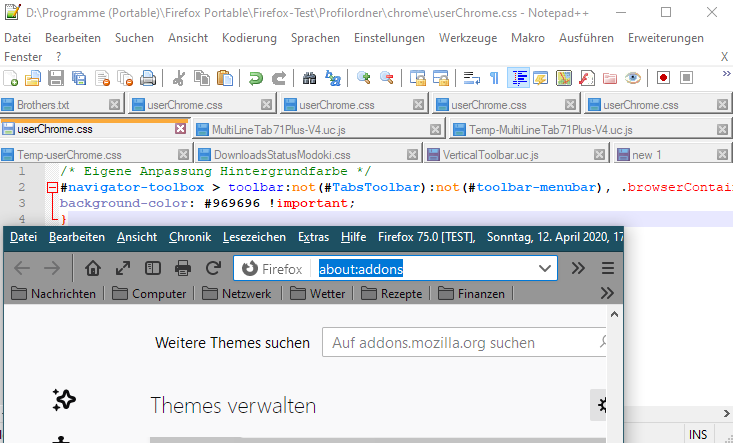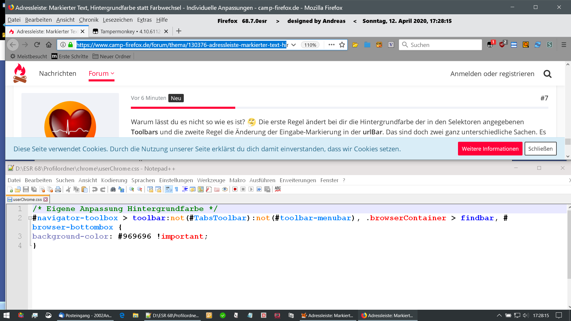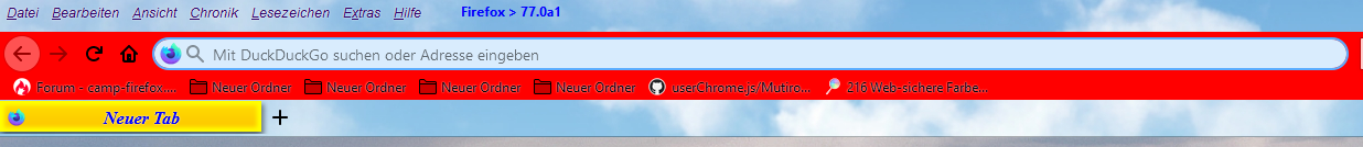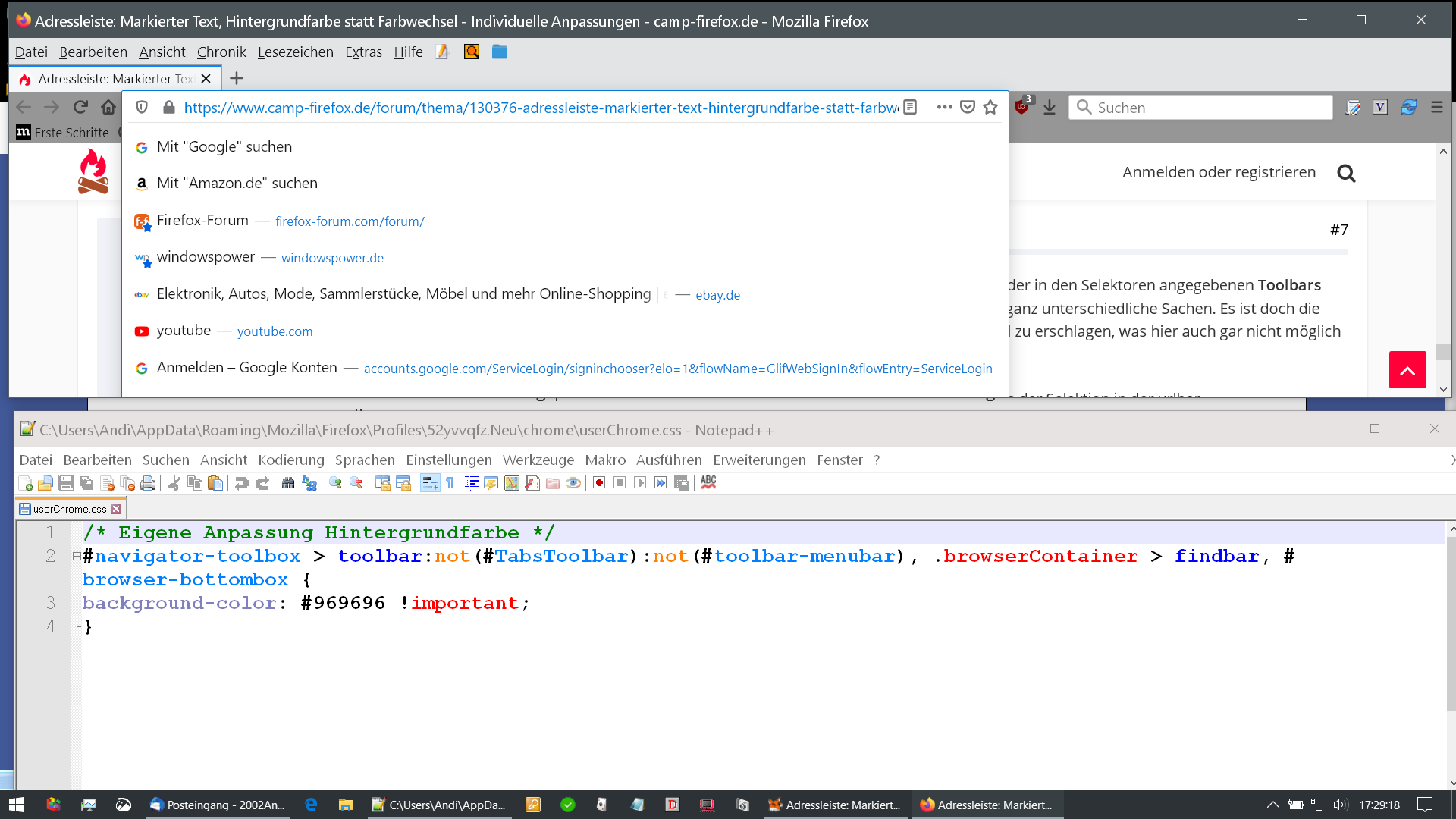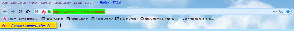 Mit einer kleinen Ergänzung "repariert" dein Code meinenCSS/*************** Adressleiste den Text bzw URL markiert mit anderer Farbe ***************************/ #urlbar-input::selection { background-color: #0078D7 !important; color: #ffffff !important; }