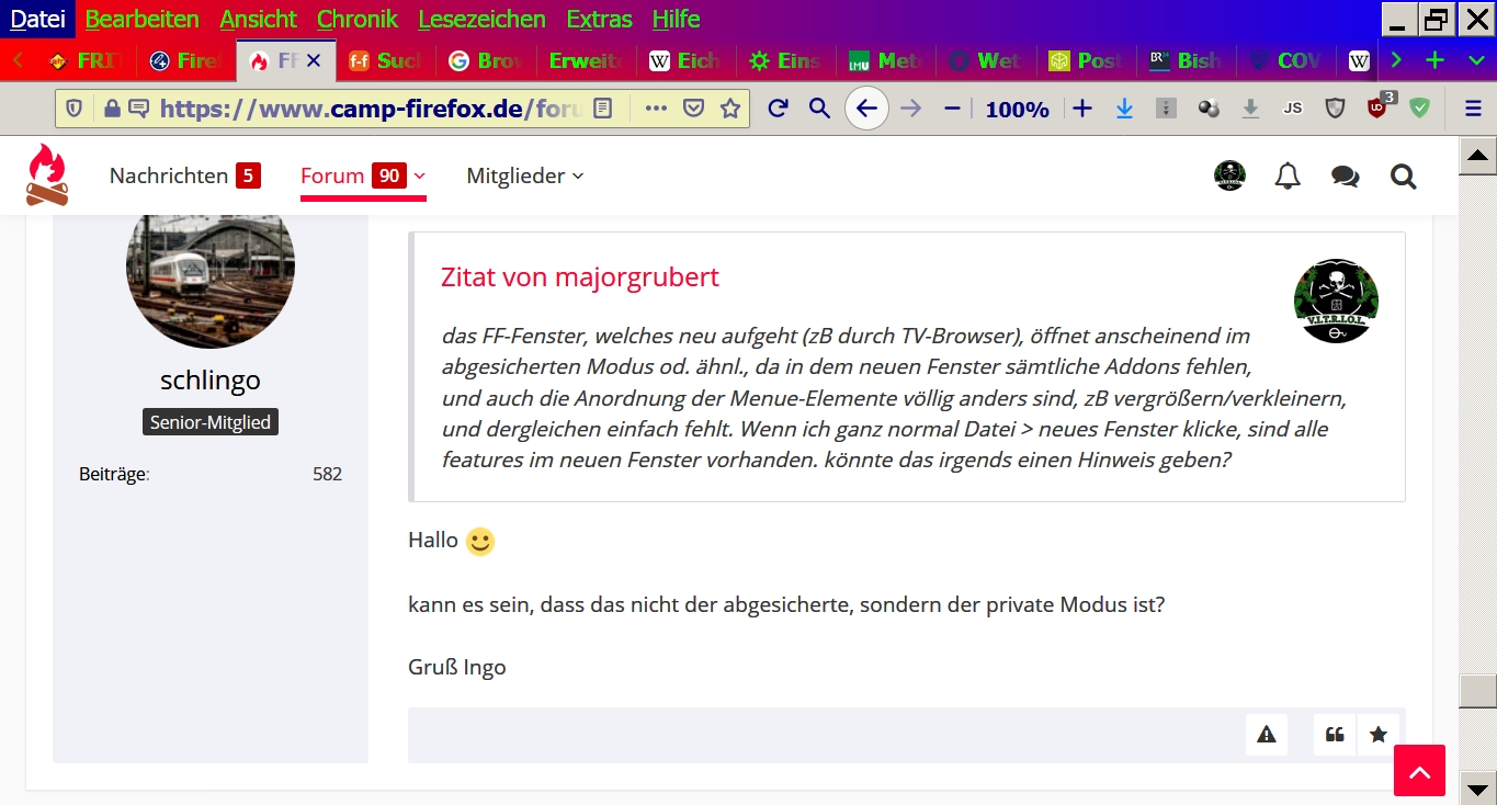 Achja, und was ich gerade feststelle: die Lesezeichen in dem neu geöffneten Fenster sind babyblank, also nichts vorhanden, im Gegensatz zu den Lesezeichen der standardmäßig geöffneten Fenster (deren sind es 2), dort sind alle angesammelten Lz da....
