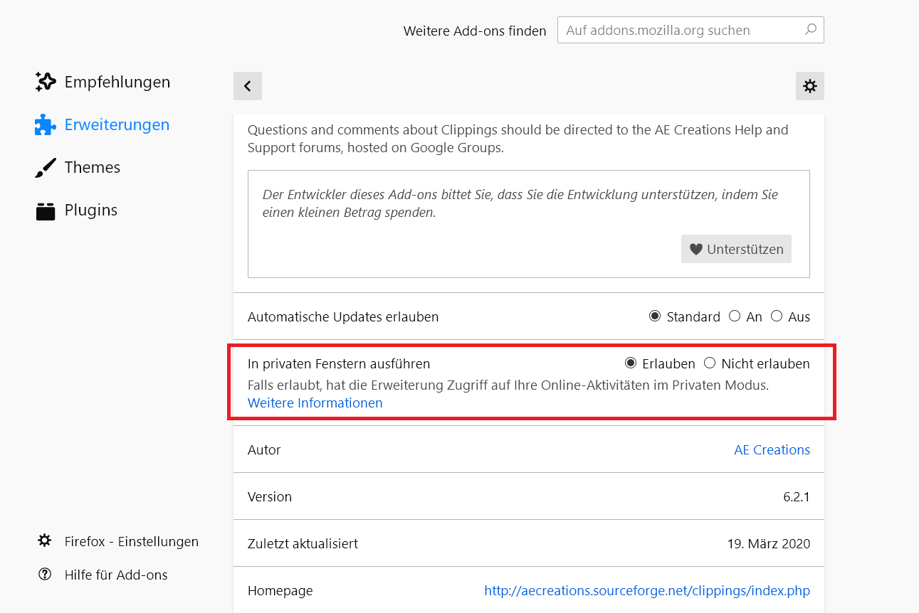• das FF-Fenster, welches neu aufgeht (zB durch TV-Browser), öffnet anscheinend im abgesicherten Modus od. ähnl., da in dem neuen Fenster sämtliche Addons fehlen, und auch die Anordnung der Menue-Elemente völlig anders sind, zB vergrößern/verkleinern, und dergleichen einfach fehlt. Wenn ich ganz normal Datei > neues Fenster klicke, sind alle features im neuen Fenster vorhanden. könnte das irgends einen Hinweis geben?