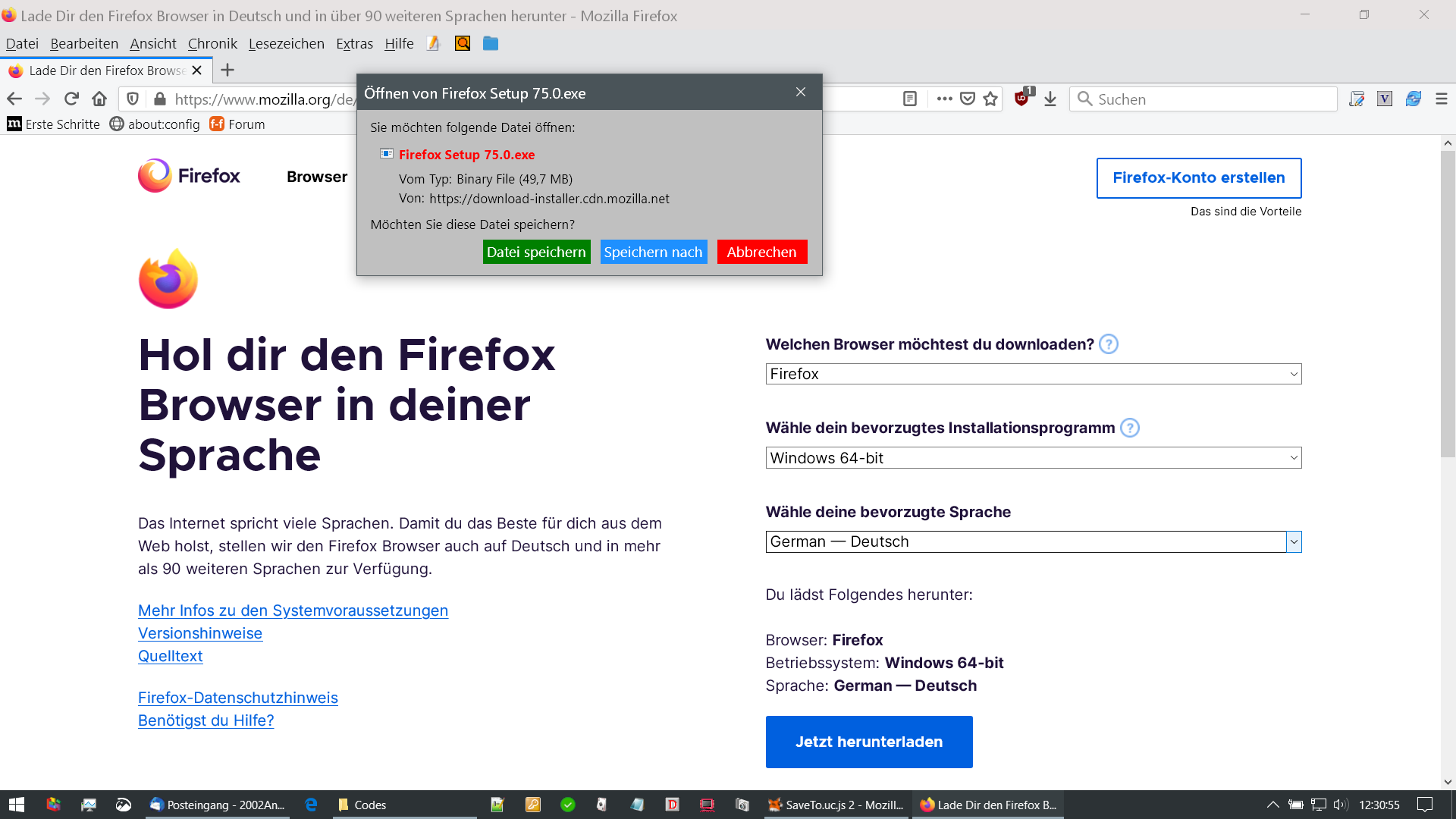 Im 74er und einem Profil 77 öffnet sich bei Betätigen "Datei speichern" ein zusätzliches Fenster:
