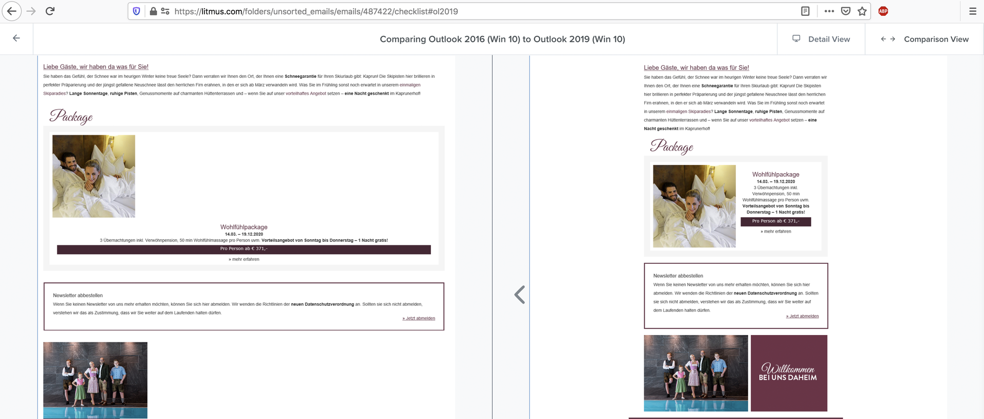 Wie gesagt, es ist möglich, dass E-Mails auch in älteren Outlook-Versionen nicht so kaputt aussehen. Sonst würde man ja viel mehr kaputte Newsletter sehen. Aber um diesen Newsletter zu reparieren, müsste das Newsletter-Template komplett neu geschrieben werden. Der Vergleich zeigt jedenfalls, dass es in der 2019er-Version große Verbesserungen bzgl. der Fähigkeiten gab. Und der Screenshot zeigt einen echten Newsletter. Was ich die ganze Zeit schreibe, ist also nicht nur ein theoretischer Fall.
