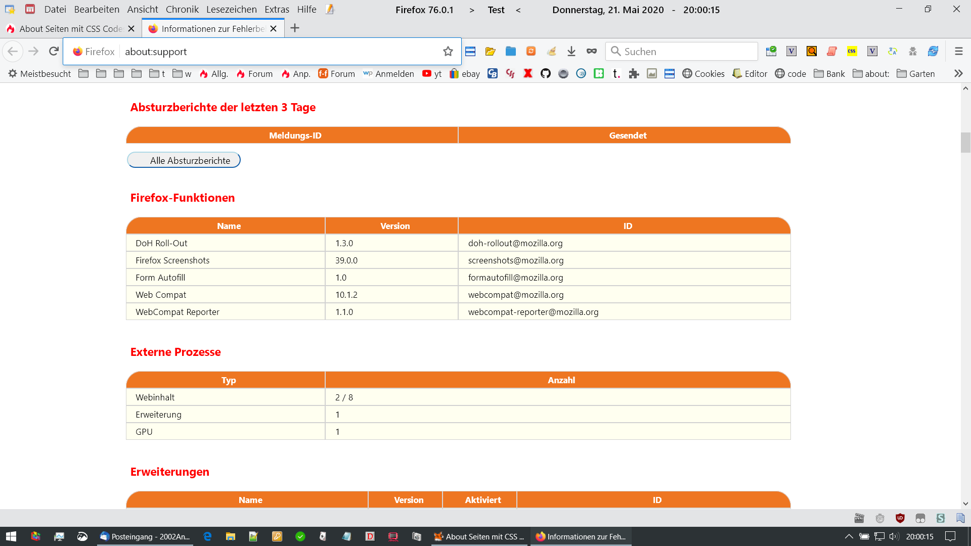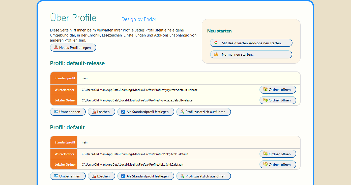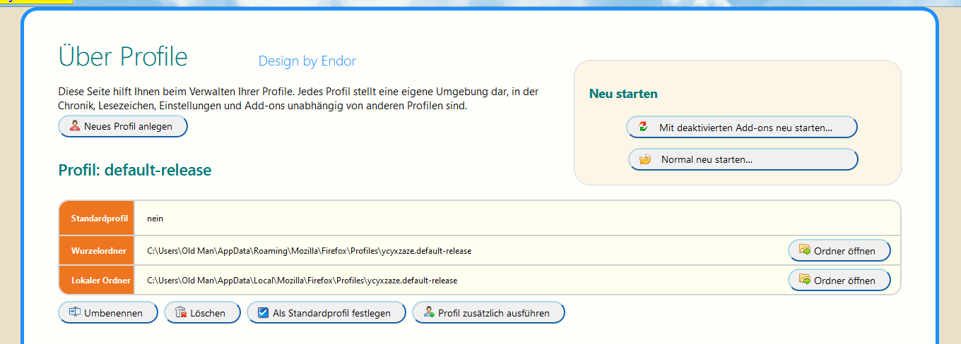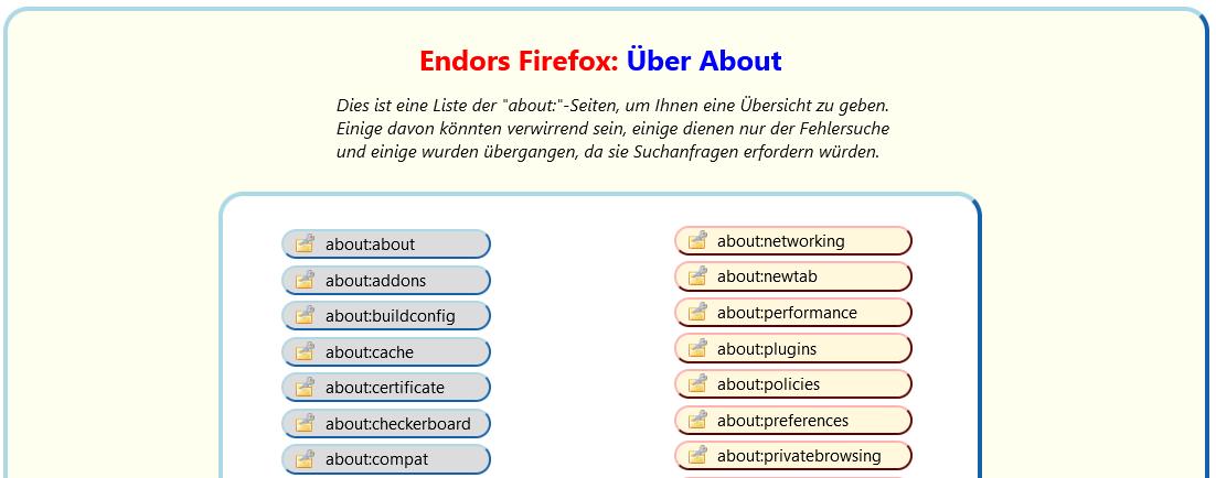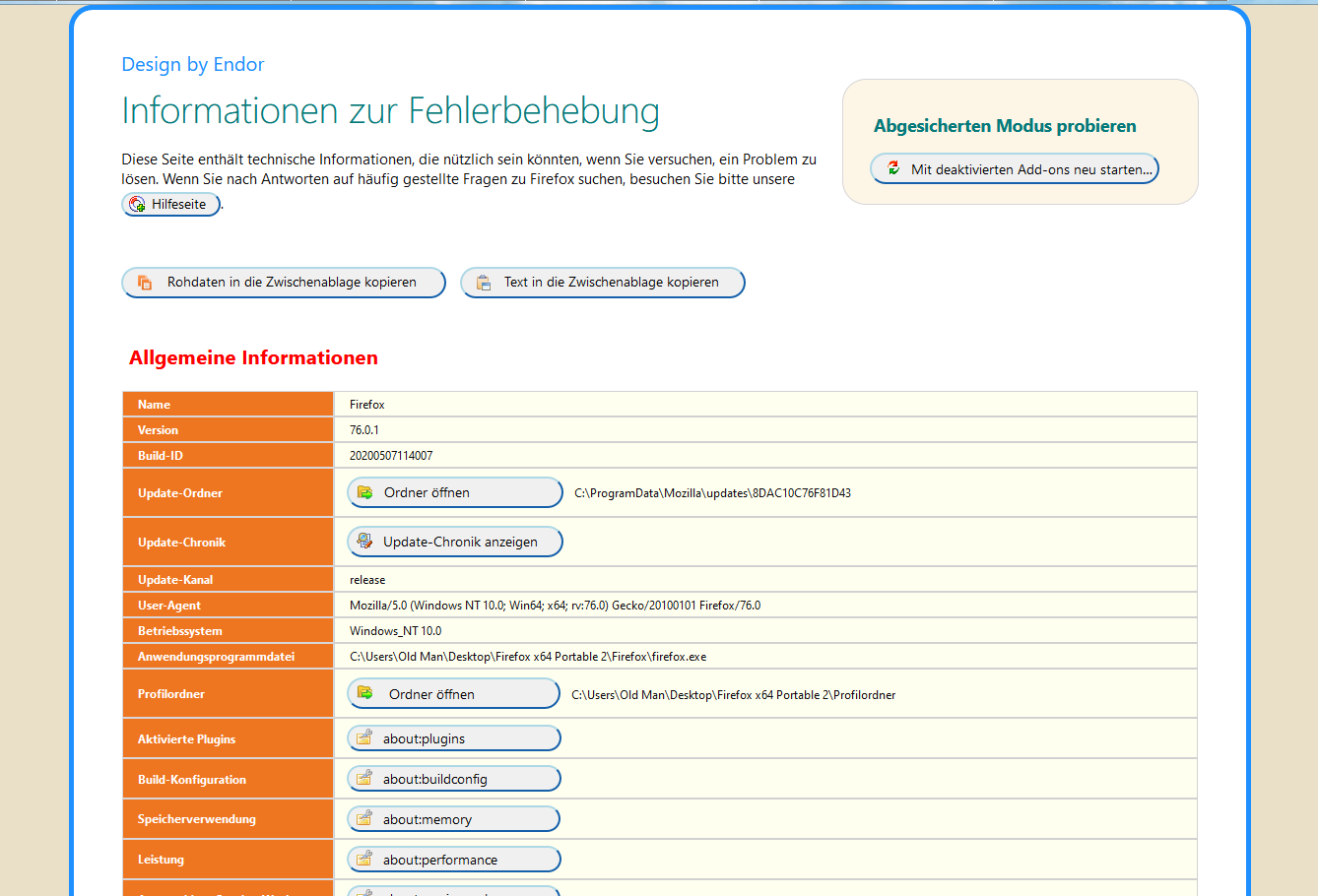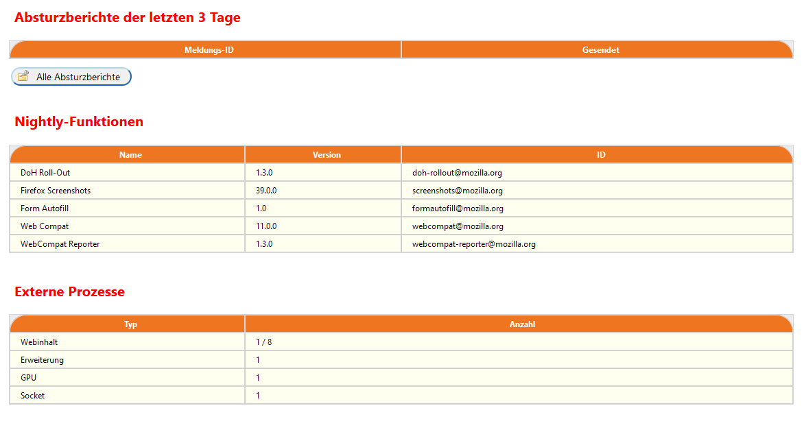 So, Endor, da mich der Einwurf von Sören auch zum Nachdenken bewegt hat, und ich ihm absolut Recht geben muss, dass in der weiteren Entwicklung immer neue Anpassungen vorgenommen werden, es dann dadurch immer wieder zu Nachbesserungen bei deinen bewunderswerten Arbeiten kommen muss (kann). Besonders fällt mir das aber jetzt schon bei about:support auf, für jede Version von Fox eine andere Variante. Und es nimmt ja auch jetzt noch kein Ende, weil jeder eine andere Hardware, bzw. Konfiguration verwendet, die dann unterschiedliche Anpassungen erfordert.