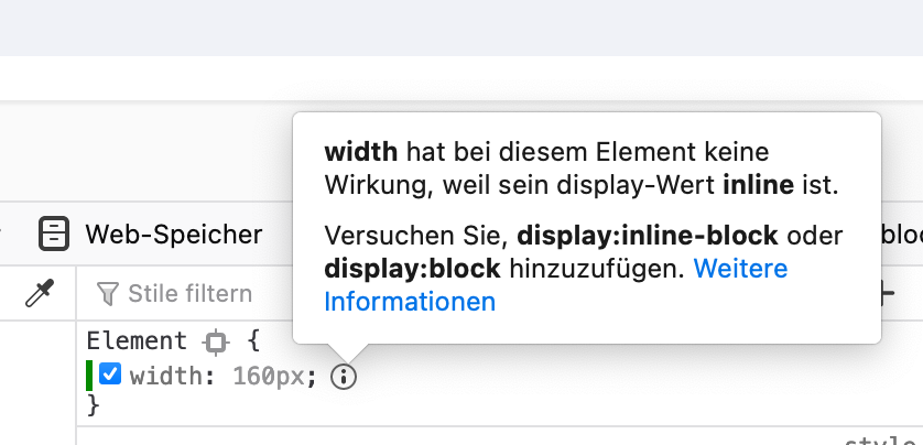 Wenn eine Eigenschaft nicht wirkt, gibt es dafür Gründe - und Firefox zeigt diese an. Mal an einem beliebigen Link demonstriert: