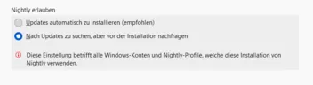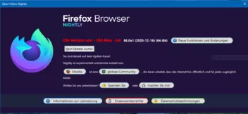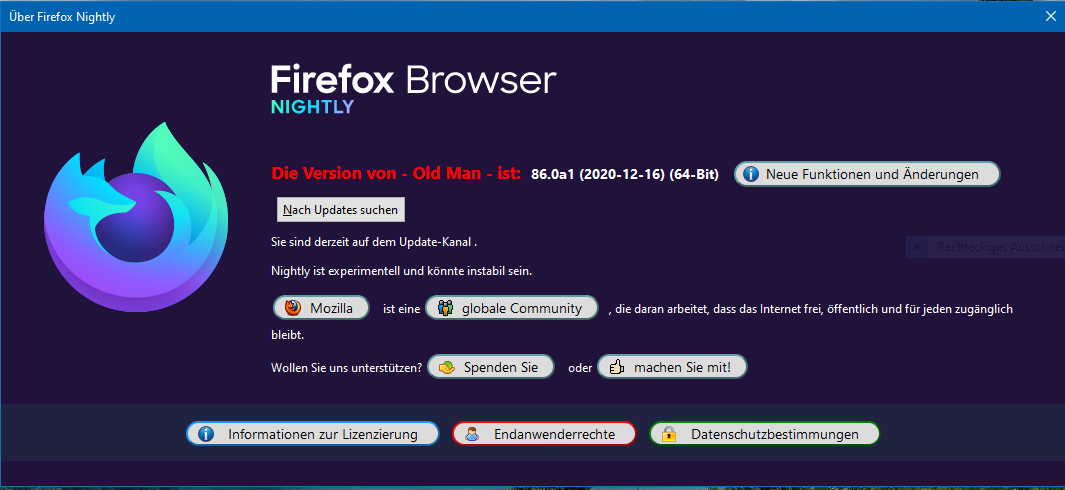 Diese verwende ich in allen Versionen, nur erschien der Button erstmals seit gestern im Nightly. Komisch daran ist, nicht immer. Gerade habe ich eine Version von 85 auf 86 aktualisiert, nach dem Update wie immer die Bestätigung auf Aktualität. Den Nightly weiter offen gelassen, nach einer Weile den Dialog geöffnet, da erscheint der Button.:/