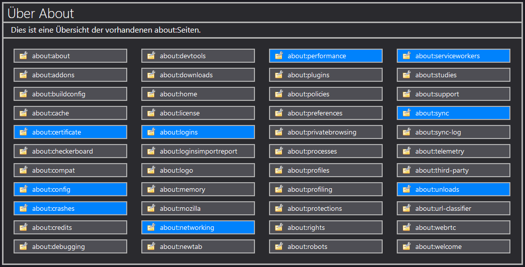 content: "Dies ist eine Übersicht der vorhandenen about:Seiten."!important;