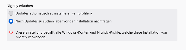 Diese verwende ich in allen Versionen, nur erschien der Button erstmals seit gestern im Nightly. Komisch daran ist, nicht immer. Gerade habe ich eine Version von 85 auf 86 aktualisiert, nach dem Update wie immer die Bestätigung auf Aktualität. Den Nightly weiter offen gelassen, nach einer Weile den Dialog geöffnet, da erscheint der Button.:/