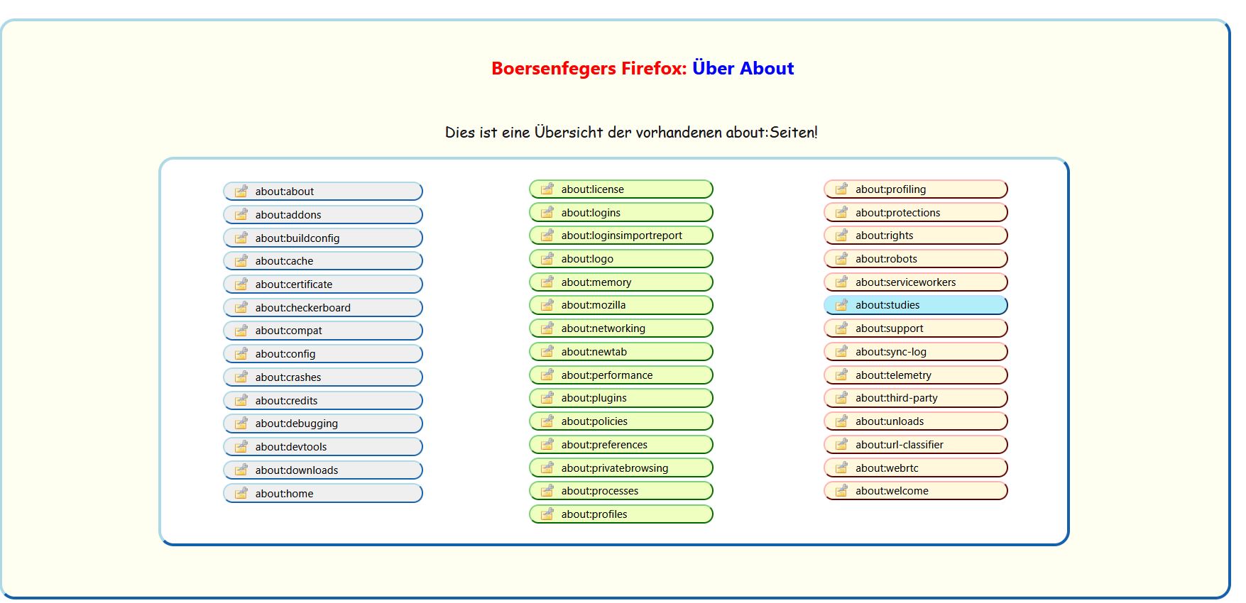 • Ich hätte die Antwort 1012 an Endor adressieren sollen, denn von ihm stammt der Code für about:about, mein Fehler :rolleyes: