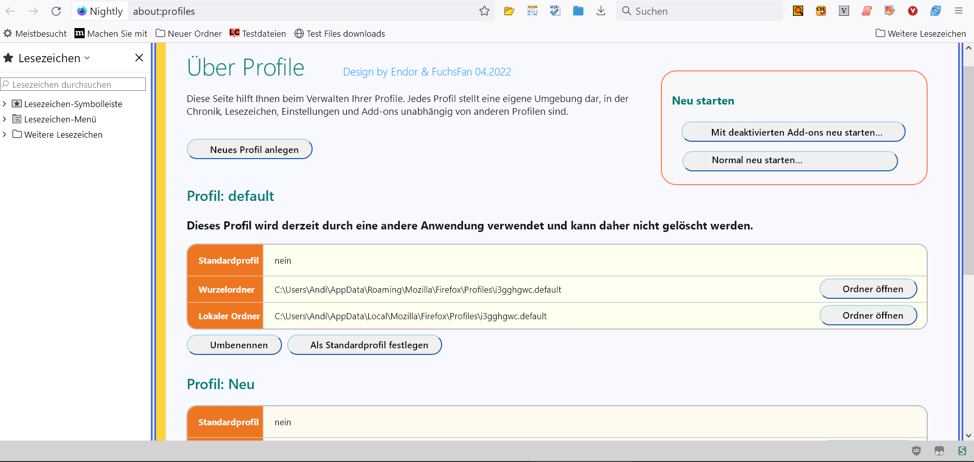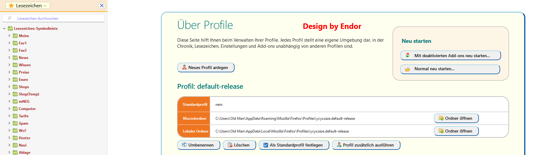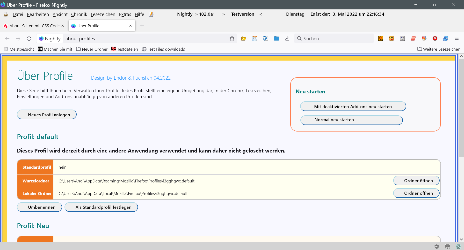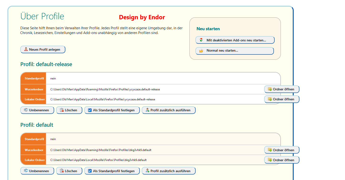 • Endor kann es sein, dass dein Code für about:profiles mit FF106 keine Funktion mehr hat? Bei mir erscheint diese Seite seit dem Update im normalen Look und nicht im angepassten...