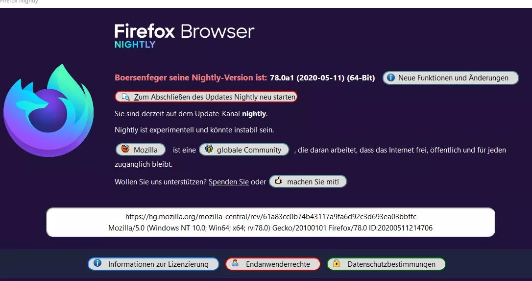Alles anzeigen/* About : Dialog */ @-moz-document url-prefix("chrome://browser/content/aboutDialog.xhtml"){ #version:before {content: "Boersenfeger seine Nightly-Version ist:"; font-size:17px !important; font-weight: bold! important; color:#F08080 !important; margin-right: 6px !important;} #version {font-weight: bold! important; font-size:16px !important;} #version {margin-top: 30px !important; color: #FFFFFF !important;} #aboutDialog{height: 350px !important; } #agent {margin-left: -140px !important; margin-bottom: 10px ! important; max-height: 60px !important; margin-right: 84px !important; margin-top: 30px !important; padding-top: 5px !important;} #agent {-moz-appearance: none !important; border-radius:14px!important;} #agent .textbox-input-box {margin-top: -1px !important; margin-left: 12px !important;} #bottomBox {background-color: #202340 !important; margin-bottom: 30px !important;} #aboutDialog{background-color: #202340 !important;} #updateButton{ min-width: 360px !important; margin-top: 5px!important; margin-bottom: 5px !important;} #trademark { margin-bottom: -40px !important; margin-top: 16px !important; font-size: 15px !important; background-color: #202340 !important;} #leftBox {margin-top: 60px !important; } /* Build ID, about_Dialog css, Text mittig.*/ window #aboutDialog vbox #aboutDialogContainer hbox {font-size:15px !important;} #clientBox vbox {font-size:15px !important;} #rightBox textarea #agent{ text-align:center!important; margin-top: 5px!important; margin-bottom: 10px ! important; } #updateButton{ -moz-appearance:none!important; background: gainsboro url("file:///c:/Users/Martin/AppData/Roaming/Mozilla/Firefox/Profiles/5p31hc0i.Nightly/chrome/Icons/index1.gif")no-repeat !important; padding-left:30px!important; background-position:13px 3px!important; font-size:15px!important; border-radius:14px!important; border-color:red !important; border-style:outset !important; border-width:2px !important; color:black !important; margin-bottom: 10px !important; margin-top: 10px !important;} #updateButton:hover{ -moz-appearance:none!important; background: #B2EDFA url("file:///c:/Users/Martin/AppData/Roaming/Mozilla/Firefox/Profiles/5p31hc0i.Nightly/chrome/Icons/index2.gif")no-repeat !important; padding-left:30px!important ; background-position:13px 3px!important;} #updateButton .button-box { padding-top: 0px!important; padding-bottom: 0px!important; -moz-padding-start: 3px!important; -moz-padding-end: 3px!important;} [href="about:license"]{ -moz-appearance:none!important; background: gainsboro url("file:///c:/Users/Martin/AppData/Roaming/Mozilla/Firefox/Profiles/5p31hc0i.Nightly/chrome/Icons/index1.png")no-repeat !important; color:black!important; margin-left: 10px !important; margin-top: 2px !important; font-size:15px!important; text-decoration:none!important; padding-right:20px!important; padding-left:40px!important; border-color:dodgerblue !important; border-style:outset !important; border-width:2px !important; background-position:10px 1px!important; border-radius:14px!important;} [href="about:license"]:hover{ -moz-appearance:none!important; background: #B2EDFA url("file:///c:/Users/Martin/AppData/Roaming/Mozilla/Firefox/Profiles/5p31hc0i.Nightly/chrome/Icons/index2.png")no-repeat !important; color:black!important; font-size:15px!important; text-decoration:none!important; padding-right:20px!important; padding-left:40px!important; background-position:10px 1px!important; border-radius:14px!important;} [href="about:rights"]{ -moz-appearance:none!important; background: gainsboro url("file:///c:/Users/Martin/AppData/Roaming/Mozilla/Firefox/Profiles/5p31hc0i.Nightly/chrome/Icons/index3.png")no-repeat !important; color:black!important; margin-left: -28px !important; margin-right: 10px !important; margin-top: 2px !important; font-size:15px!important; text-decoration:none!important; padding-right:20px!important; padding-left:40px!important; border-color:red !important; border-style:outset !important; border-width:2px!important; background-position:10px 1px!important; border-radius:14px!important;} [href="about:rights"]:hover{ -moz-appearance:none!important; background: #B2EDFA url("file:///c:/Users/Martin/AppData/Roaming/Mozilla/Firefox/Profiles/5p31hc0i.Nightly/chrome/Icons/index4.png")no-repeat !important; color:black!important; font-size:15px!important; text-decoration:none!important; padding-right:20px!important; padding-left:40px!important; background-position:10px 1px!important; border-radius:14px!important;} [href="https://www.mozilla.org/privacy/"]{ -moz-appearance:none!important; background: gainsboro url("file:///c:/Users/Martin/AppData/Roaming/Mozilla/Firefox/Profiles/5p31hc0i.Nightly/chrome/Icons/index5.png")no-repeat !important; color:black!important; margin-left: 2px !important; margin-right: 10px !important; margin-top: 2px !important; font-size:15px!important; text-decoration:none!important; padding-right:20px!important; padding-left:40px!important; border-color:green !important; border-style:outset !important; border-width:2px !important; background-position:10px 1px!important; border-radius:14px!important;} [href="https://www.mozilla.org/privacy/"]:hover{ -moz-appearance:none!important; background: #B2EDFA url("file:///c:/Users/Martin/AppData/Roaming/Mozilla/Firefox/Profiles/5p31hc0i.Nightly/chrome/Icons/index6.png")no-repeat !important; color:black!important; font-size:15px!important; text-decoration:none!important; padding-right:20px!important; padding-left:40px!important; background-position:10px 1px!important; border-radius:14px!important;} [href="http://www.mozilla.org/"]{ -moz-appearance:none!important; background: gainsboro url("file:///c:/Users/Martin/AppData/Roaming/Mozilla/Firefox/Profiles/5p31hc0i.Nightly/chrome/Icons/index1.ico") no-repeat !important; color:black!important; margin-left: 2px !important; margin-right: 10px !important; font-size:15px!important; text-decoration:none!important; padding-right:15px!important; padding-left:35px!important; border-co