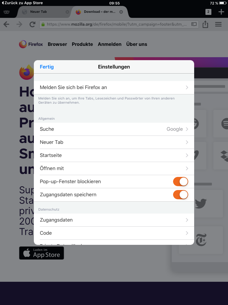 Ich habe das iPad neu aufgesetzt und FF (V25.1) installiert