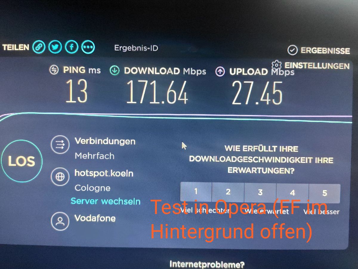 Führe ich NUR in Opera einen Speedtest aus, komme ich auf die oben erwähnten Werte. Mache ich den Test in Opera und lasse Firefox im Hintergrund geöffnet, bekomme ich fast die gleichen niederigen Werte (um 100 Mbps), als wenn ich den Test in FF mache. Schließe ich FF und mache den Speedtest erneut in Opera, bekomme ich wieder die hohen Werte (rund 600 Mbps). Ich bin ratlos...