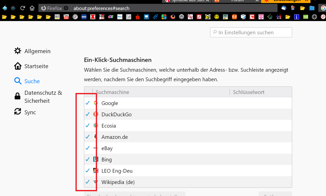 Leider habe ich nun das Problem, dass in der Suchleiste von Firefox einige Symbole verschwunden sind, z. B. das Amazon, das Wikipedia und das Ebay-Symbol (siehe Screenshot - anstatt der Symbole weiße Flächen).