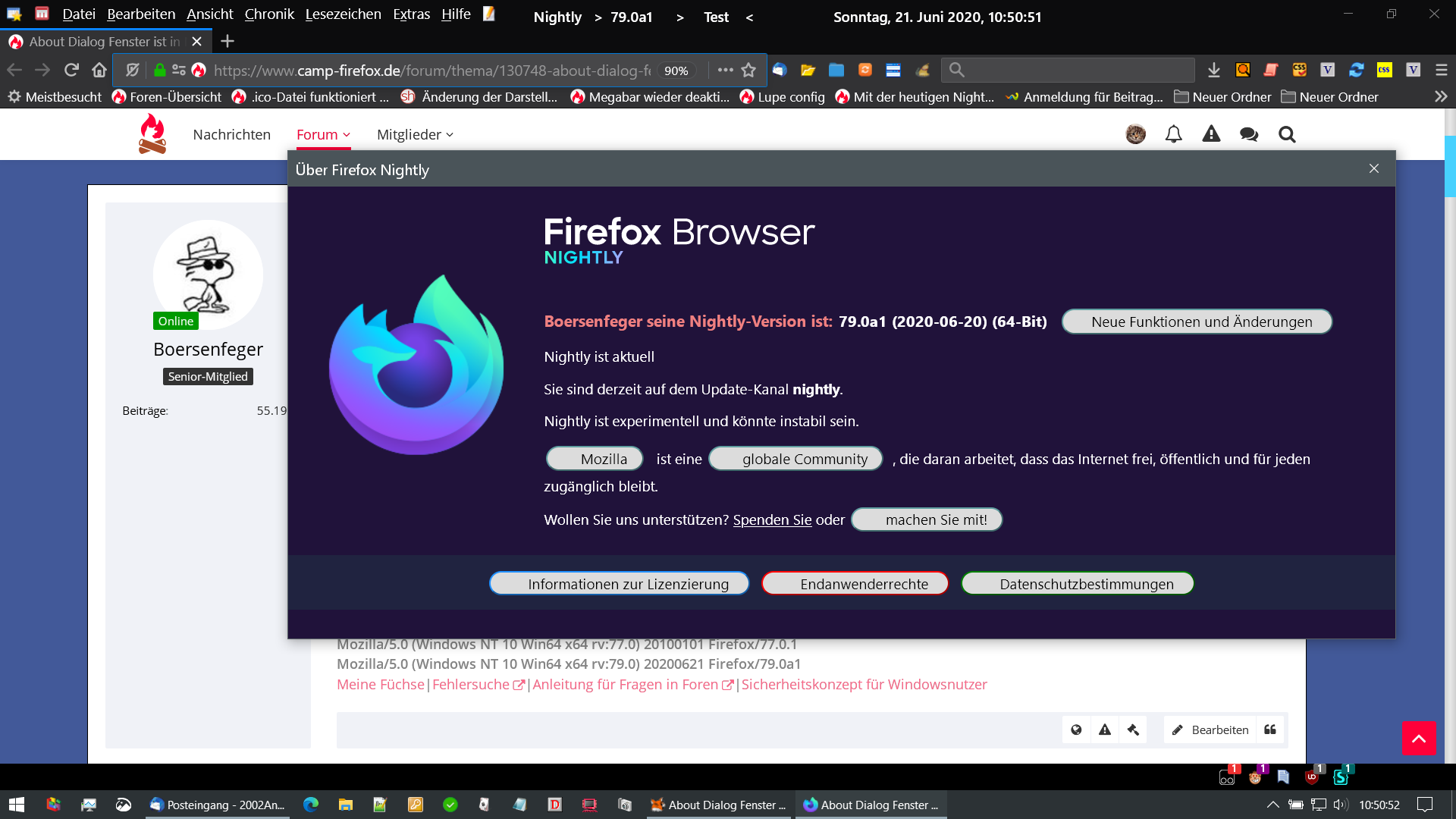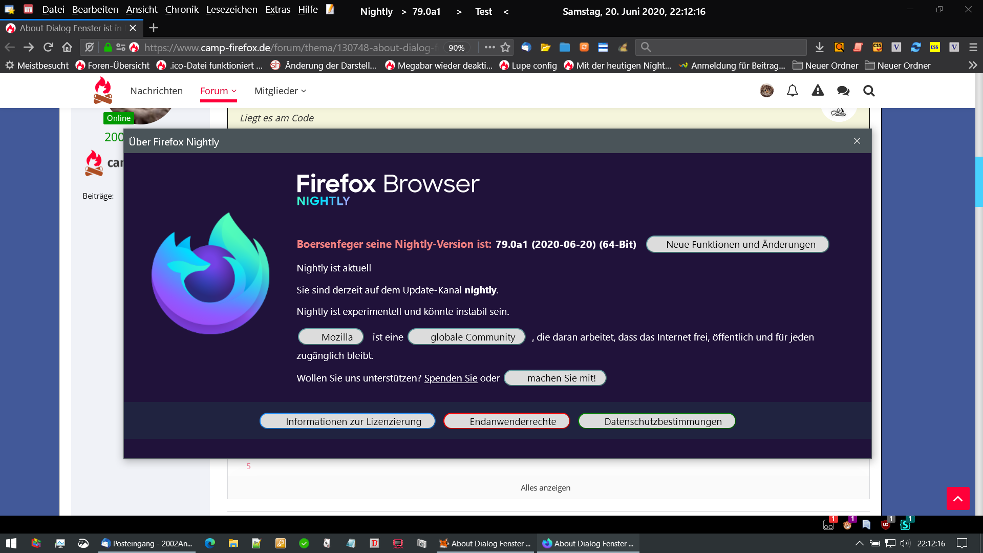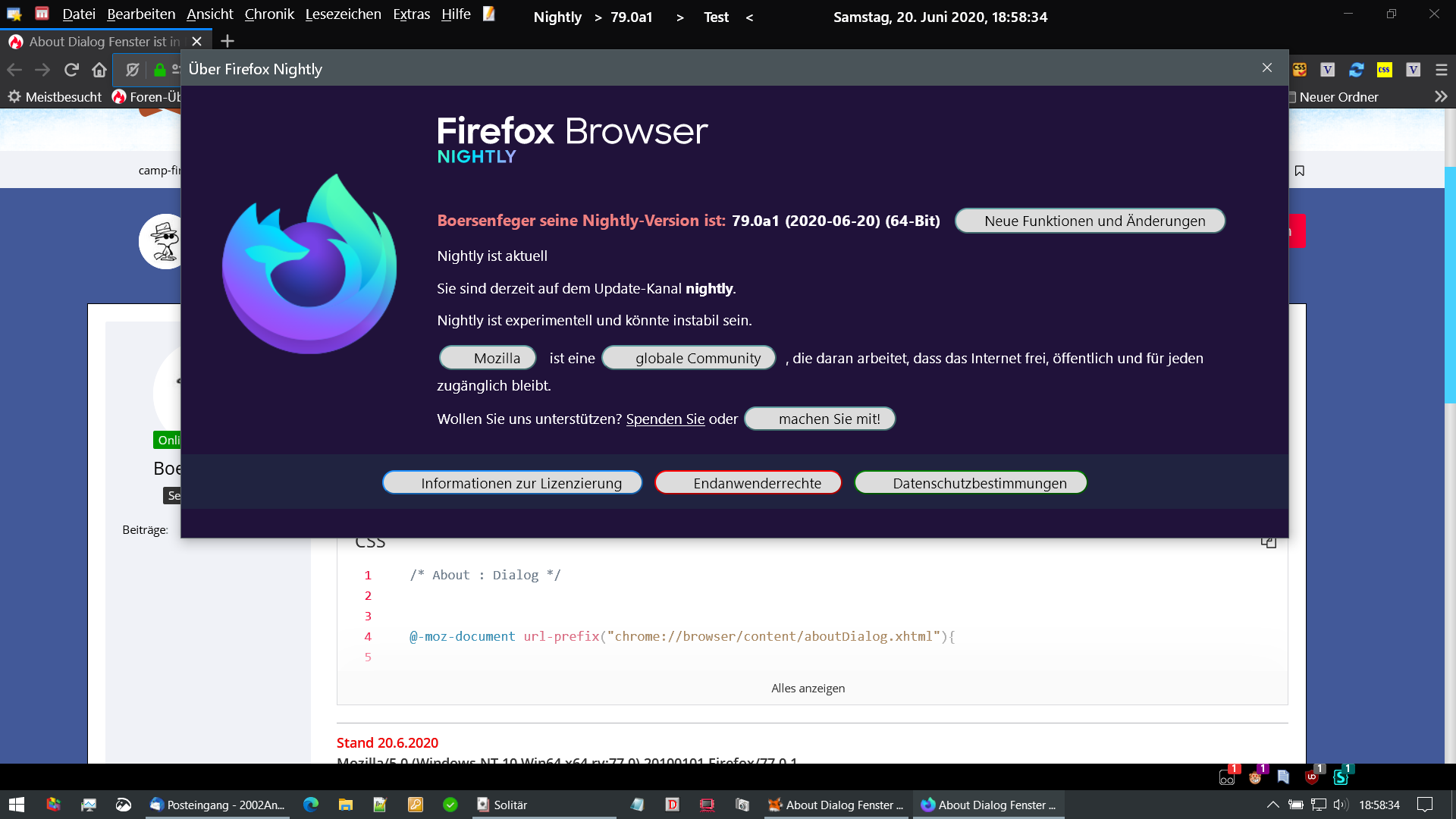 Hi, nachfolgender Code ist installiert... seit ein paar Tagen wird mir ein schwarzes Fenster angeboten, wenn ich auf Hilfe, über Nightly klicke.