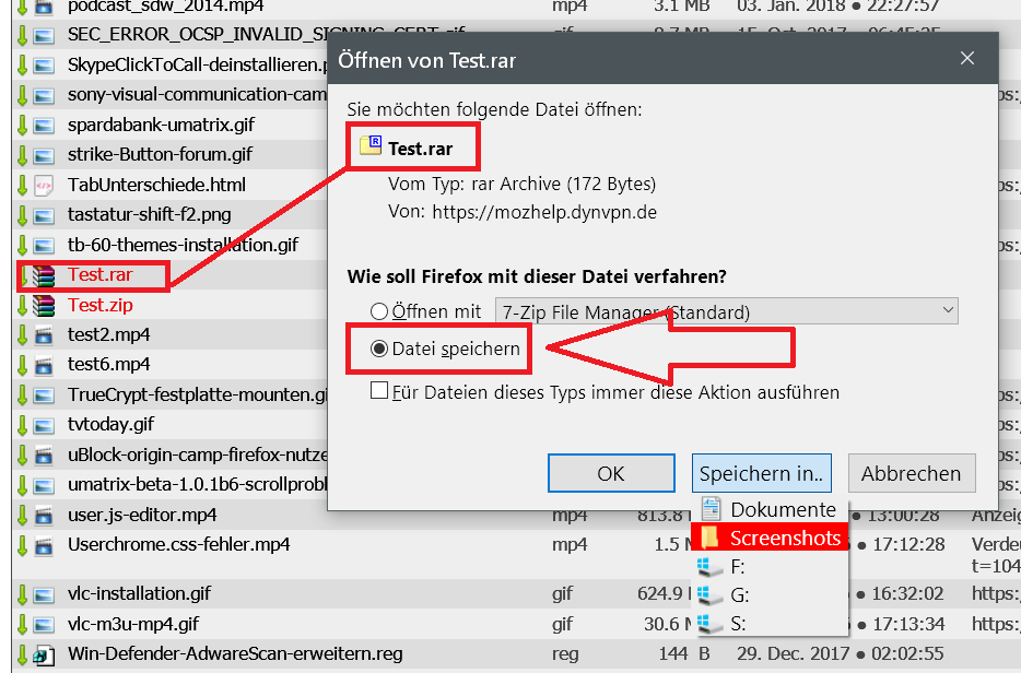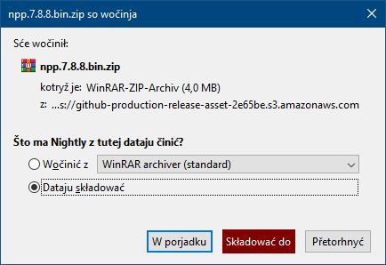 Ist jetzt Sorbisch, aber bei mir ist immer „Dataju składować (Datei speichern)“ aktiviert und nach Klick auf „Składować do“, das ist die Speichern-Schaltfläche des Skripts, wird immer dahin abgespeichert, wohin ich es speichern möchte. Direktes Öffnen mit WinRAR geschieht nur bei "Wočinić z (Öffnen mit)“ und Klick auf W porjadku (OK).