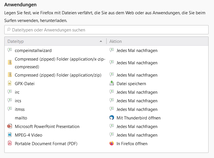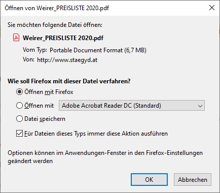 Die neueste Version von Firefox erlaubt das öffnen von .pdf im Browser. Ich habe die entsprechenden Einstellungen, hoffentlich richtig, ausgeführt. Trotzdem erhalte ich jedesmal wieder die Frage, wie weiter verfahren werden soll. Ich habe die checkbox "Für Dateien dieses Typs immer die Aktion ausführen" markiert, beim nächsten mal erscheint die Frage trotzdem wieder.
