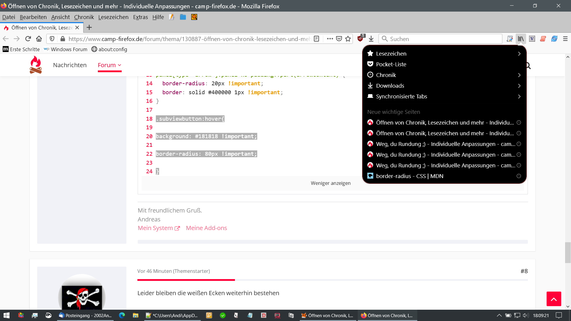 In meiner Symbolleiste habe ich das Symbol für Offnen von Chronik, Lesezeichen und mehr. Nach Klick darauf öffnet sich ein Dropdownfenster mit Lesezeichen, Pocket Liste, Chronik usw. Da würde ich gerne die Hintergrundfarbe, die Schriftfarbe und die Hoverfarbe ändern. Geht das mit einem CSS-Code?