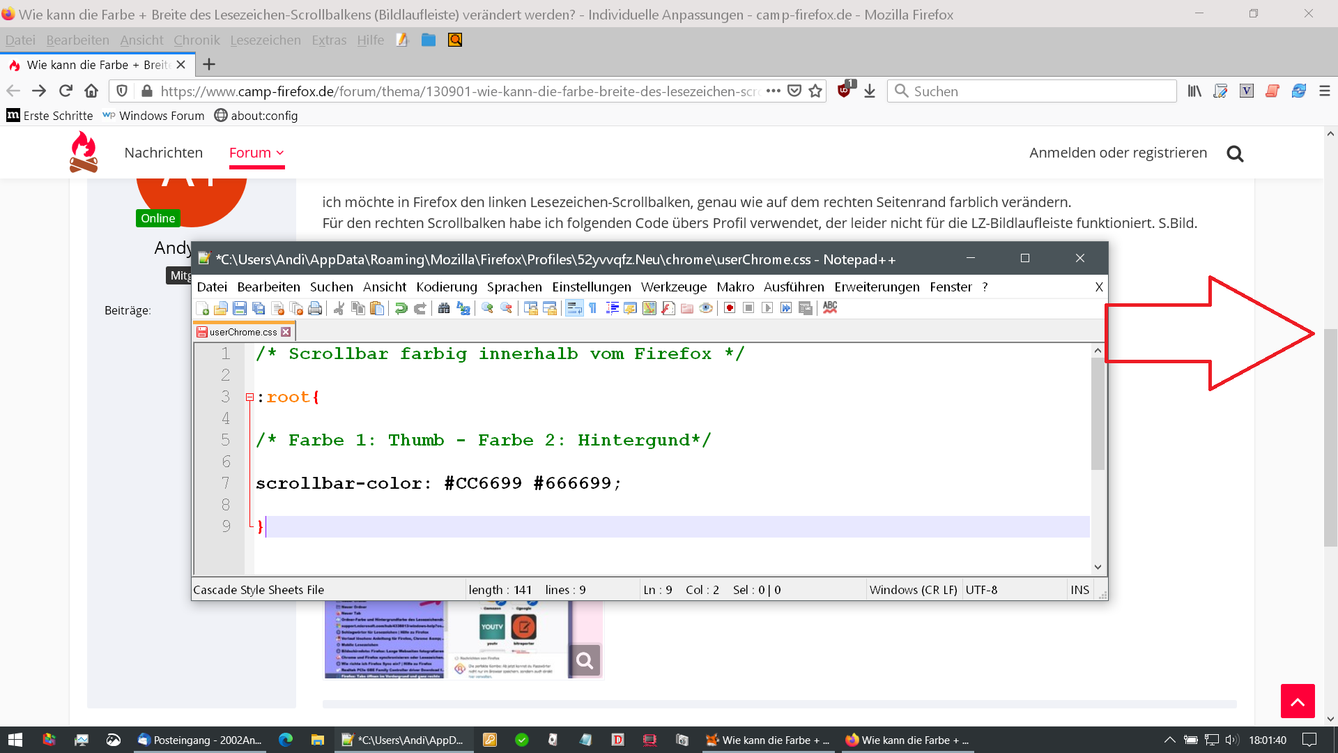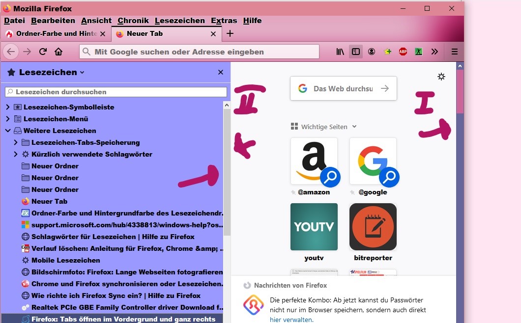 ich möchte in Firefox den linken Lesezeichen-Scrollbalken, genau wie auf dem rechten Seitenrand farblich verändern.