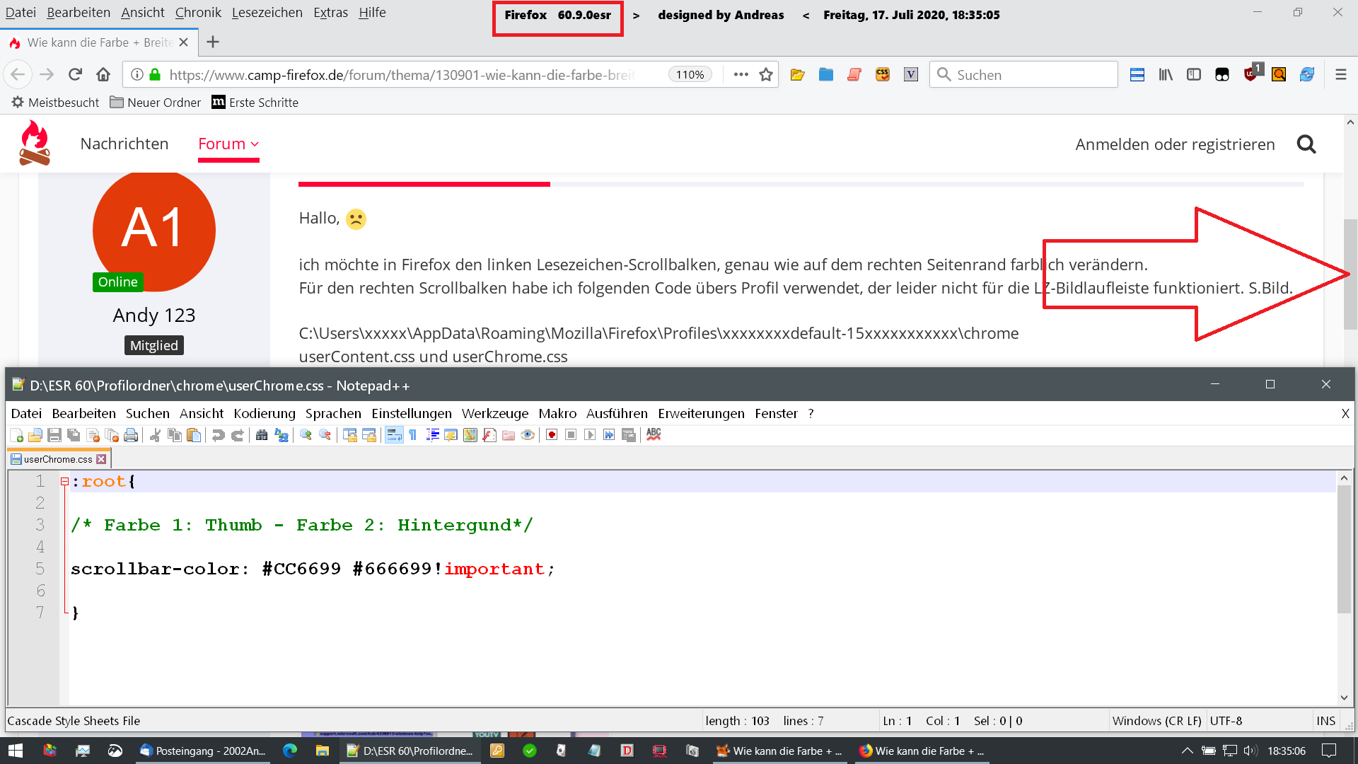 Das liegt daran, dass du deinen Code innerhalb der userChrome.css leicht anpassen musst. Bei scrollbar-color muss am Ende noch !important angehängt werden, damit der Farbwert des Scrollbalken überschrieben wird.