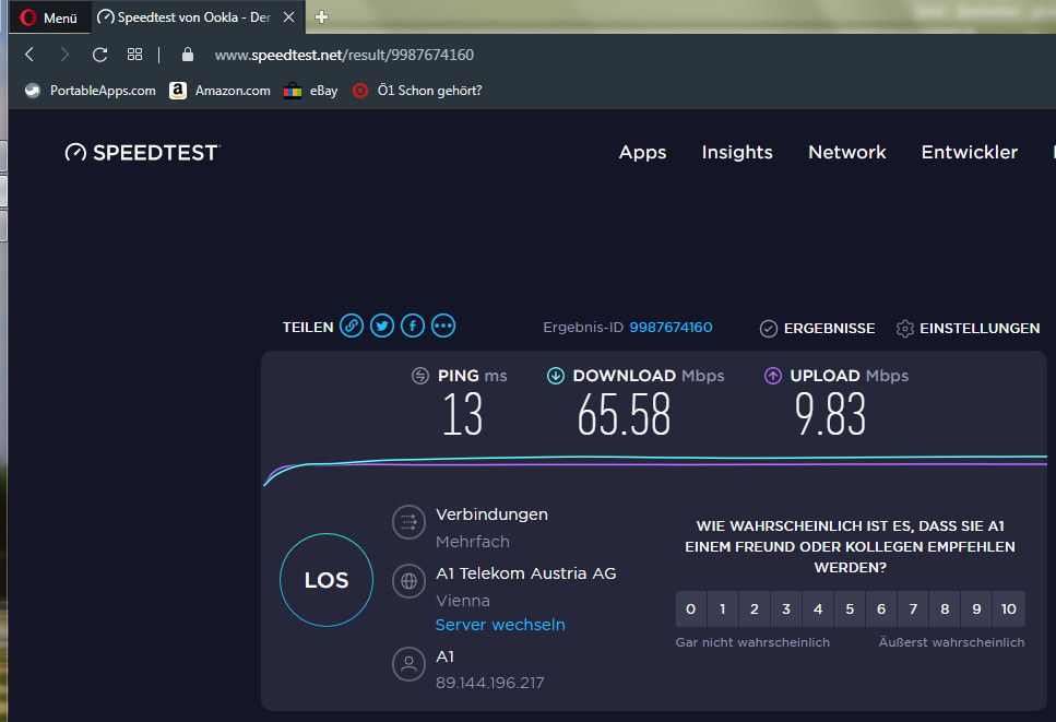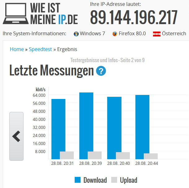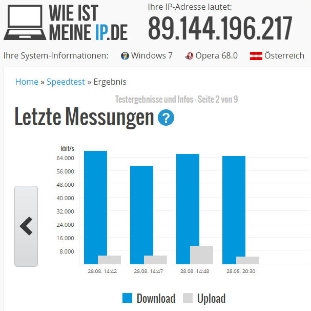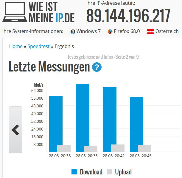 Keine Besserung. Dann die Überraschung: Mit dem Browser Opera habe ich Werte von unglaublichen 433 mbit/s (der höchste Wert), mit zwei anderen Messanbietern Werte zwischen 345 bzw. 387 mbit/s. erreicht. Was sagt mir das? Firefox ist nicht mehr das was er mal war??....Die Messwerte bei FF fielen rapide vor 6 Wochen. Zu der Zeit hatte ich noch Windows 8.1 installiert. Alles lief einwandfrei. Ich habe auch den Versuch gestartet, nach Installation des neuen Betriebssystems und nach Installation von Firefox (ohne irgendwelche Zusatz-Adds) die Geschwindigkeitsmessung durchzuführen. Am Ergebnis hatte sich nichts geändert....