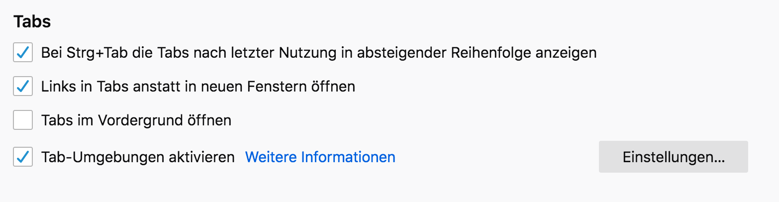 Konkretes Problem: Ich möchte per Javascript eine neue Seite öffnen lassen. Das kann in einem neuen Tab oder in einem ganz neuen Browser-Fenster passieren. Konkret wird diese Entscheidung von den folgenden Einstellungen in der about:config beeinflusst: