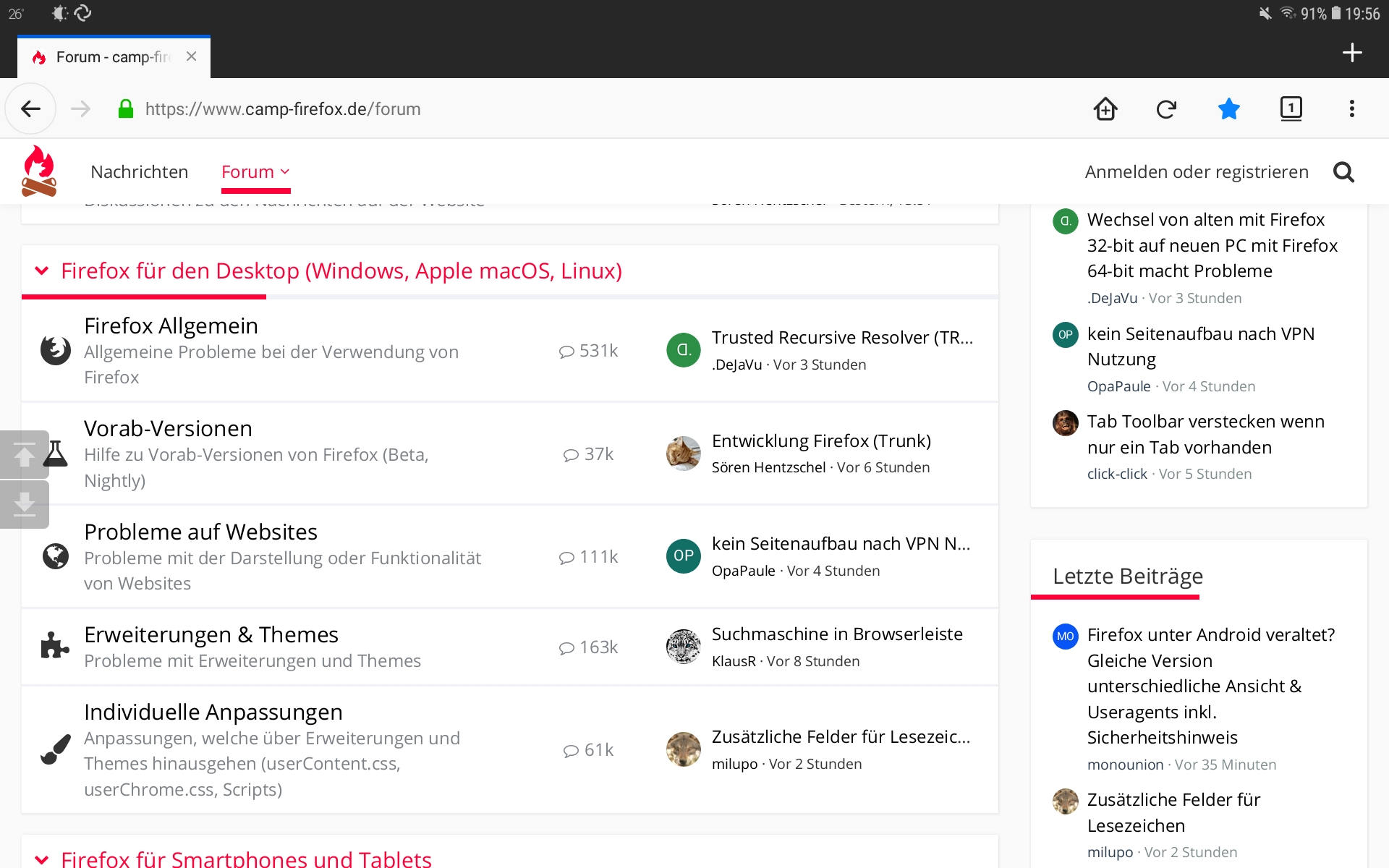 • Wie bereits gesagt nutze ich das gleiche Tablet wie du (Samsung Galaxy Tab A SM-T580) und konnte diese Erfahrung so bisher noch nie machen, ausser wenn ich den UserAgent selber, per Erweiterung, verstelle. Dies lässt sich aber dann ja auch im Handumdrehen wieder umstellen bzw. zurücksetzen. Und Firefox nutzt definitiv nur eine Web Rendering Engine. Diese ist zwar schon ein paar Tage älter, aber dennoch aktuell. Erst in einigen Wochen, wenn der neu entwickelte Firefox erscheint, ist die Web Rendering Engine eine neue, aber auch dann hat Firefox nur eine einzige. Ich denke eher, dass sich da Daten bei dir im Dalvikcache festgesetzt hatten, die durch Neustart des Tablets bereinigt wurden. Dieses und hin und wieder mal sein Profil bereinigen, was ja auch unter Firefox Desktop gut tut, sollte man ab und an ruhig mal machen. Eine Profil Bereinigung geht leider nur beim Tablet (ohne root) nur über den Weg: Apps - Firefox - Speicher - Daten löschen.