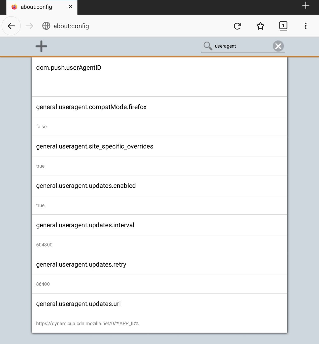 Zuletzt fiel mir auf, dass obwohl ich die letzten App Updates auf dem Tablet installiert habe, mir auf Websites wie web.de angezeigt wird, mein Browser sei veraltet. Schaue ich mir den Useragent des Browsers an, erscheint auch nicht wie auf dem Google Pixel 4 Firefox 68, sondern folgender Useragent:
