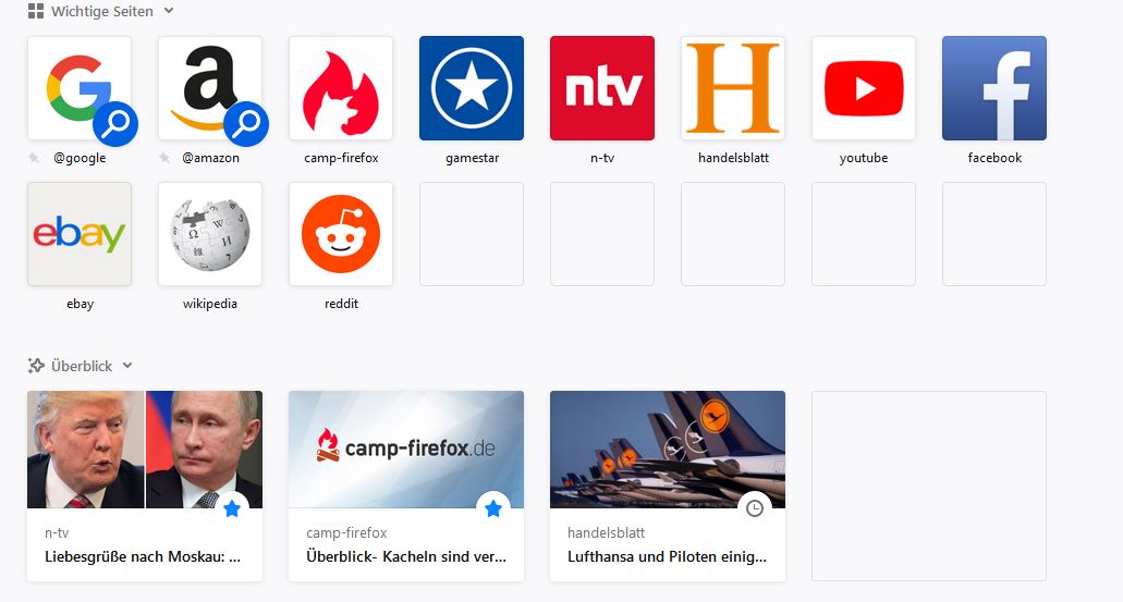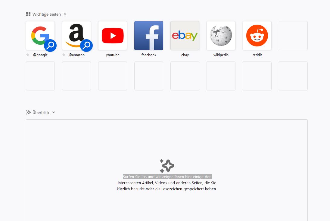 Es werden zumindest schon mal Kacheln angezeigt (die meisten noch leer), allerdings nicht wie vorher, sondern die Websites aus der Chronik der zuletzt geöffneten Seiten. Vorher hatte ich hier Kachelinhalte die sich wohl aus meinem Surfverhalten generiert hatten,