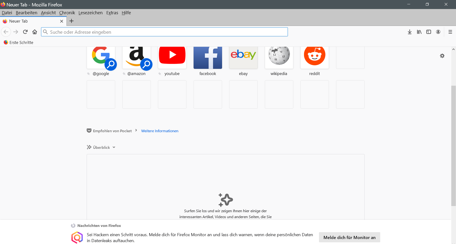 Unter "Überlick" erscheint nur ein weisses Feld mit: "Surfen Sie los und wir zeigen Ihnen hier einige der...." (s.Anhang)