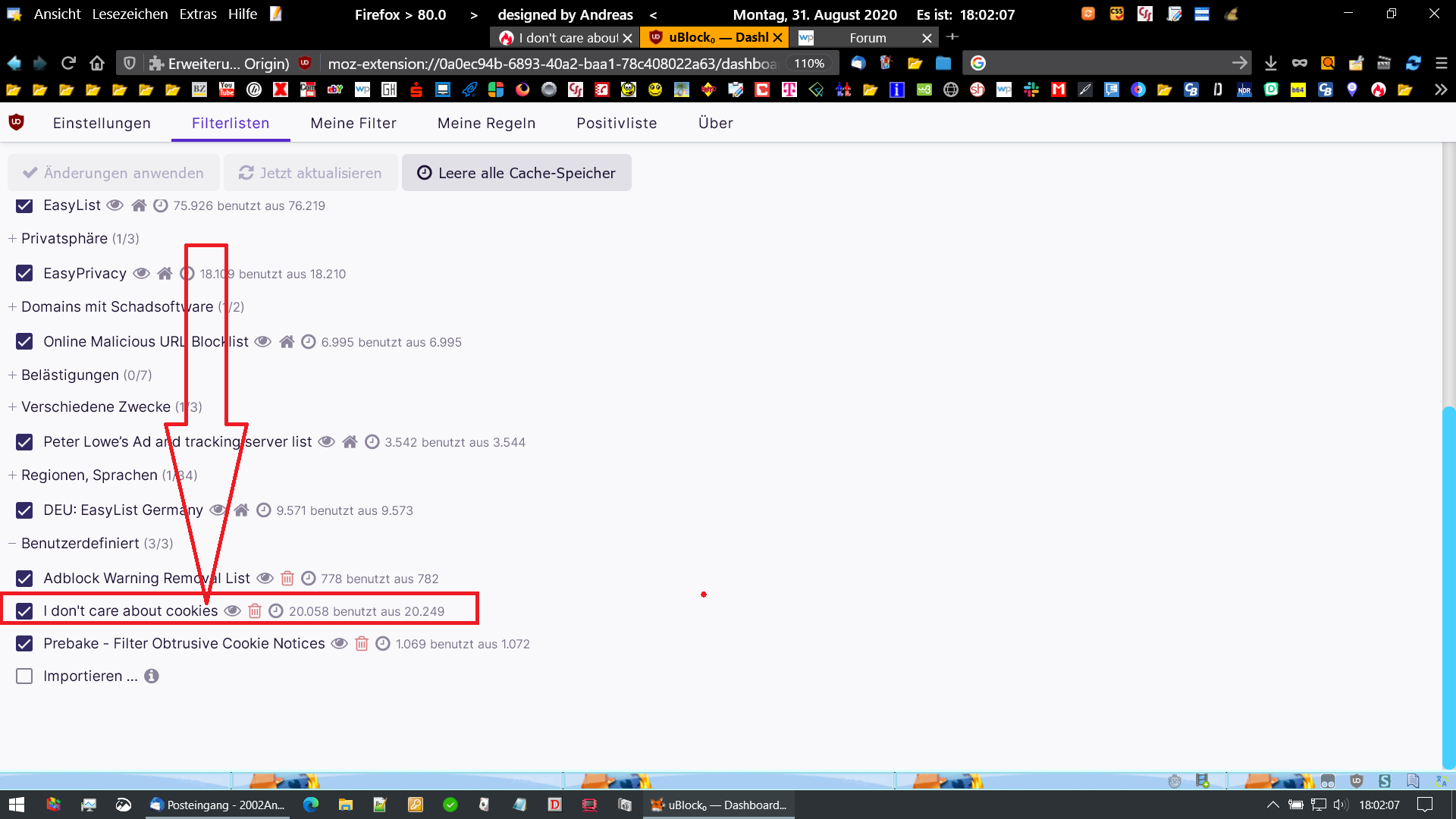 Jeder, der sich eine Erweiterung zur Bearbeitung zusätzlicher Optionen installiert, ist auch in der Pflicht, sich damit zu beschäftigen. Jene Erweiterung bietet nun mal nur an/aus, wenn dir das zu wenig Komfort bietet, dann verzichte einfach darauf oder nutze was anders. Jede Erweiterung bedeutet, dass man sich mit ihr auseinandersetzt. Die Info, dass andere, mich eingeschlossen, diese Liste in Kombination mit ublock origin, keine Probleme erzeugt, liegt in uBlock begründet, weil das mehr kann als nur an/aus. Im Grunde ist es ein Hinweis für dich, dass es mehr als nur das eine gibt. Einige können die integrierten Hilfsmittel bedienen und genau sagen, woran das einer oder andere scheitert - du bzw man muss nur für sich ableiten können und auch umsetzen können. Ist das nicht umsetzbar - dürfte Verzicht die einzige Option sein.
