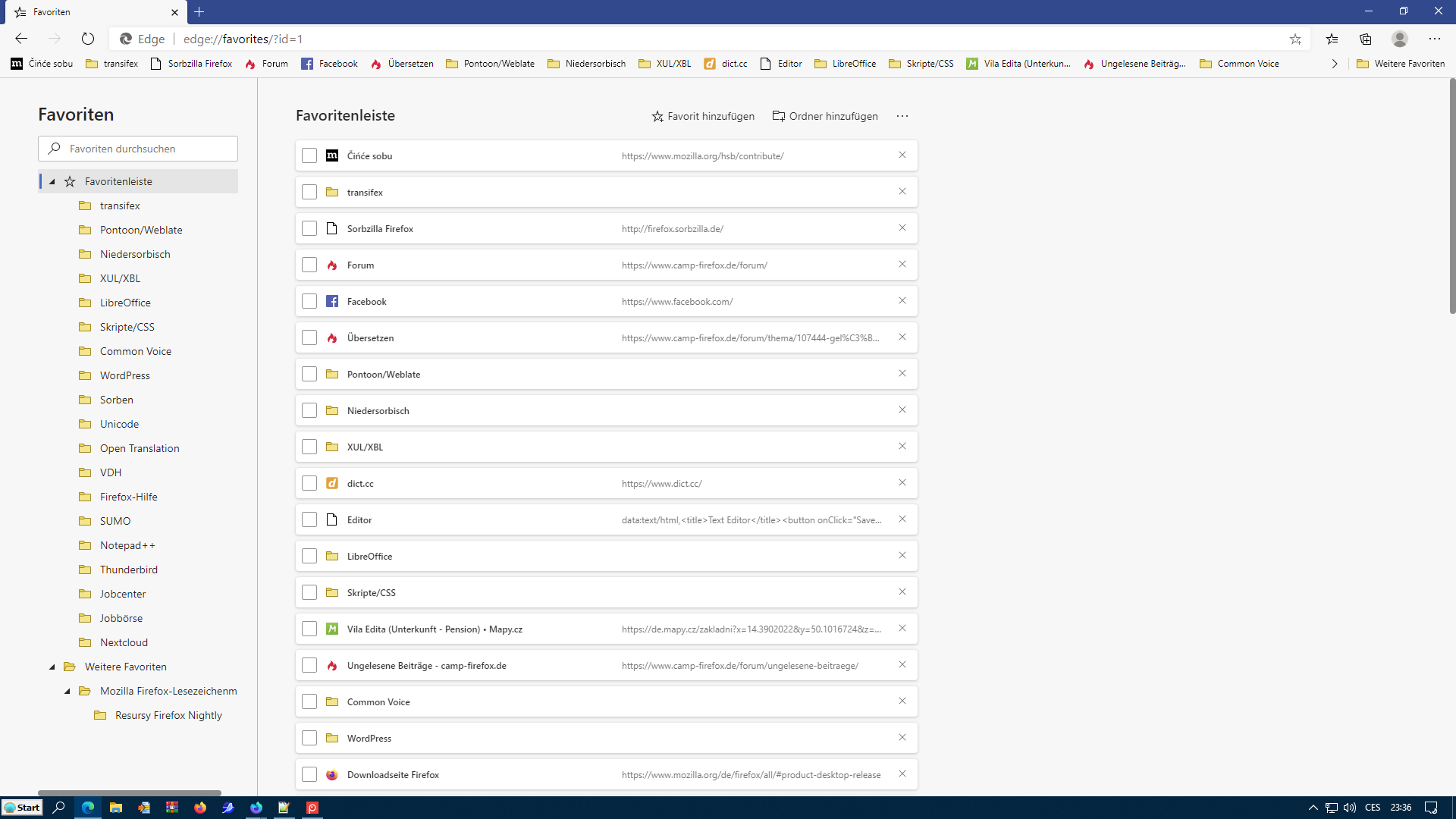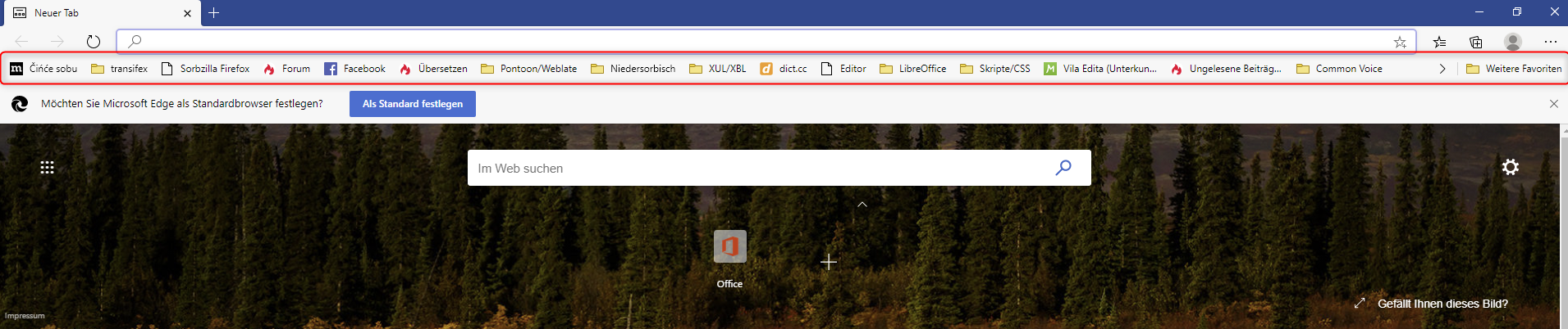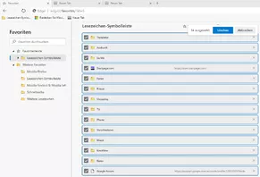 Sind das unter Favoritenleiste deine Firefox-Lesezeichen? Ich denke, das sind die Edge-Lesezeichen. Gehe mal unten unter Weitere Favoriten. Da hast du ebenfalls einen Eintrag Lesezeichen-Symbolleiste. Ich denke, die sind bei dir die Firefox-Lesezeichen. Und die müssen unter Favoritenleiste.