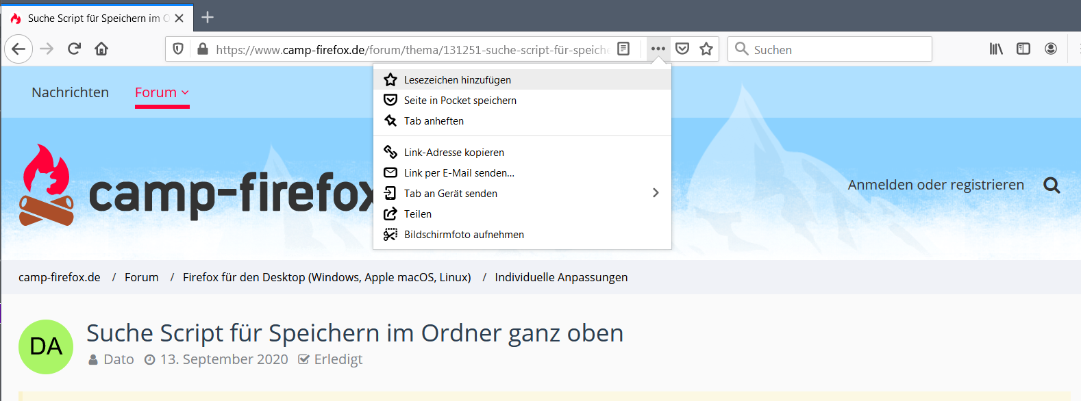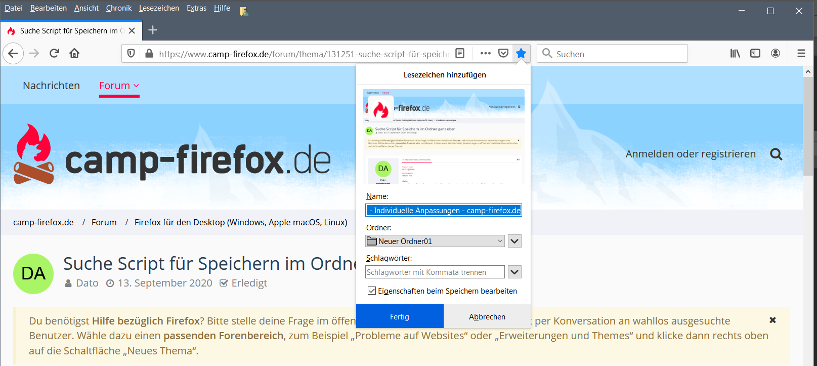 • Nur mal so: Um ein Lesezeichen abzuspeichern, reicht ein Klick auf den Stern. Mit dem Häkchen kommt auch dort das Fenster Lesezeichen bearbeiten.
