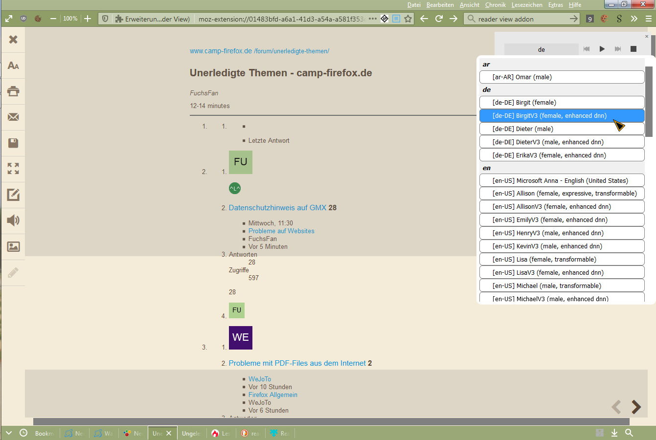 • Ich würde gerne offline gespeicherte Websites und Texte im FF vorlesen lassen.