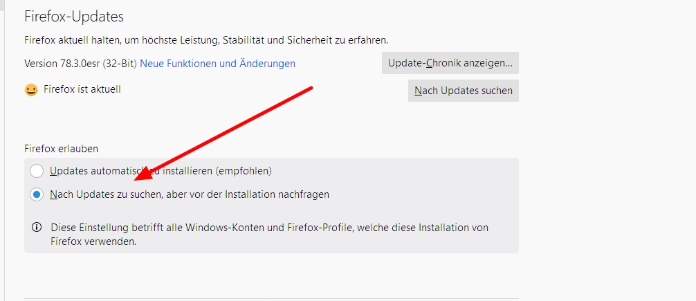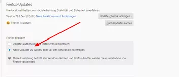 Ich habe jetzt wieder die Version 68 ESR installiert, denn ich möchte davon einen Screenshot machen, um zu zeigen, wie die Version 78 ESR aussehen soll. Aber bei der 68 ESR steht das noch auf "Updates automatisch installieren", was natürlich jetzt dumm ist.