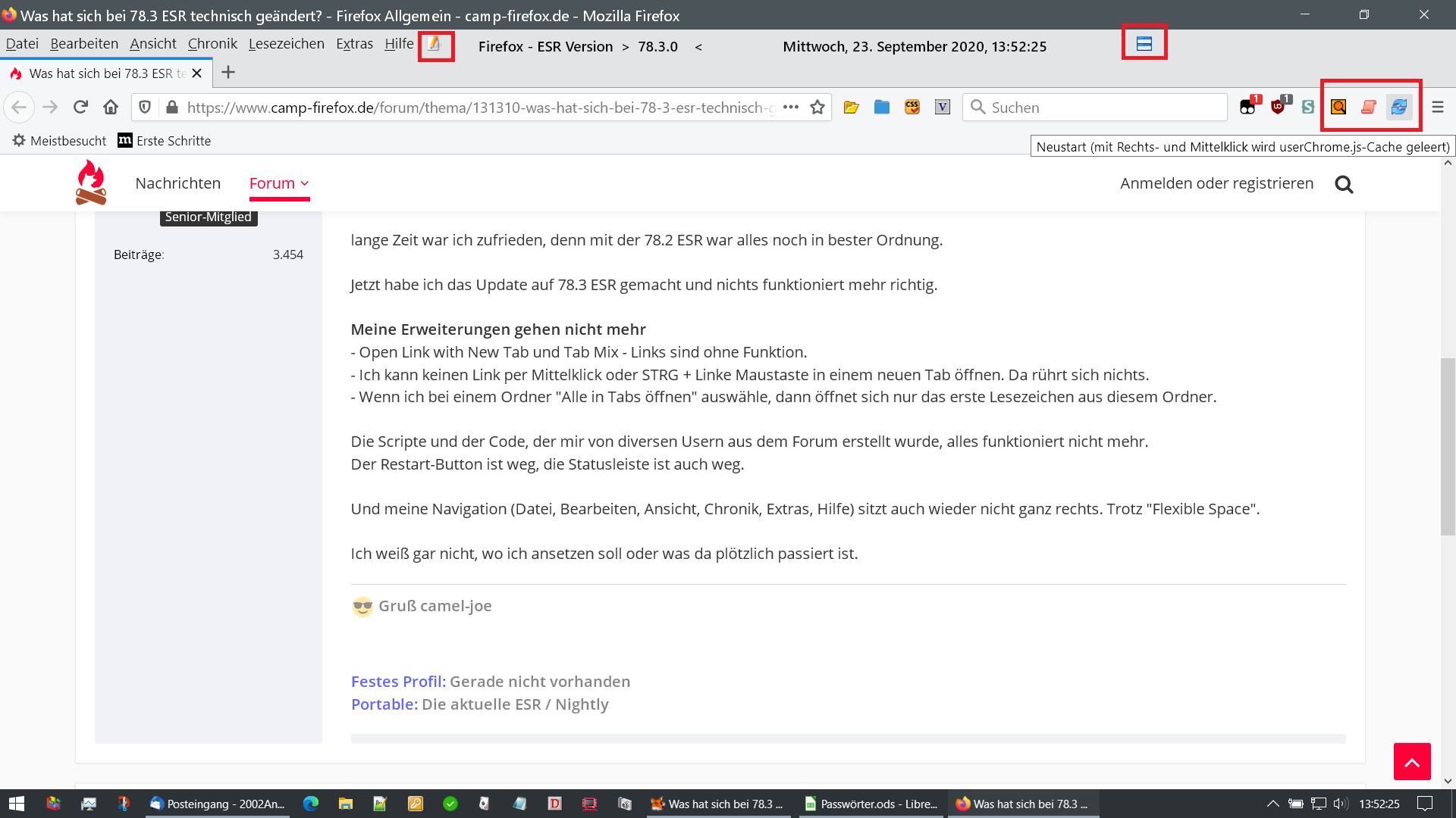 • Bist du sicher, dass du von der 78.2ESR geupdatet hast? Ich denke eher, du hattest vorher die 68.12ESR und gestern wurde über das automatische Update die Version 78.3ESR eingespielt. Der Sprung von 68 auf 78 ist - was die individuellen Anpassungen angeht - natürlich gewaltig. Das da so einiges nicht mehr funktioniert ist daher schon zwangsläufig...