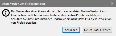 Da die alte Version nicht startet, ohne dass man die compatibility.ini löscht, habe ich ja nur die Möglichkeit Schließen oder Neues Profil,
