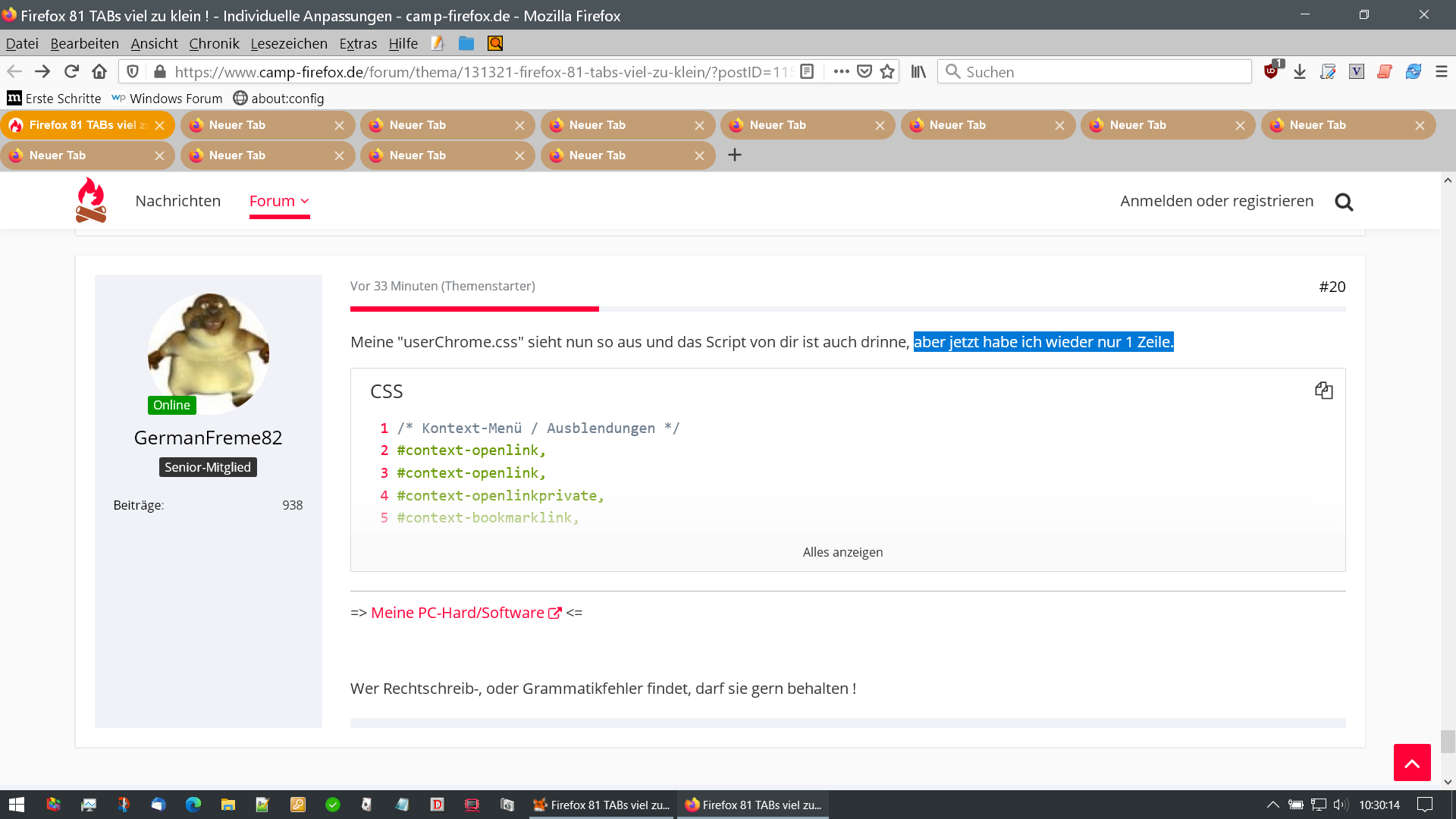 • Meine "userChrome.css" sieht nun so aus und das Script von dir ist auch drinne, aber jetzt habe ich wieder nur 1 Zeile.
