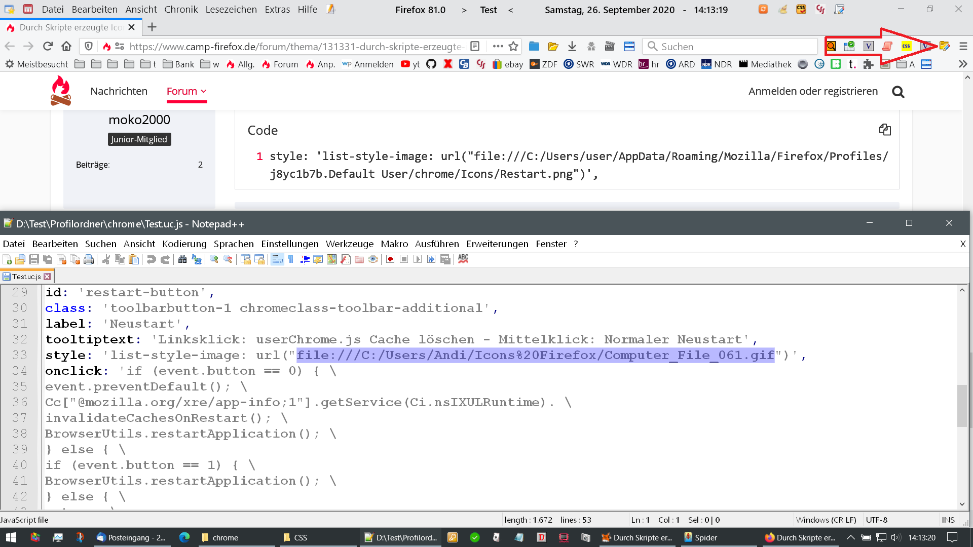 In Zeile 33 habe ich versucht, die base64 durch ein im Ordner chrome/Icons gespeichertes .png-Icon zu ersetzen.