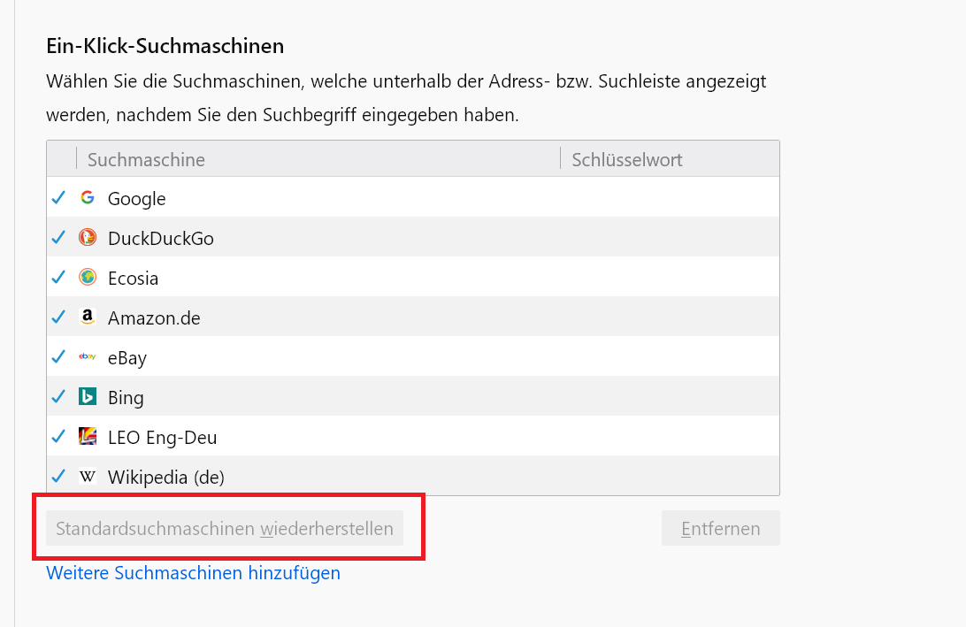 Daher verstehe ich die von FF vordefinierten Suchmaschinen