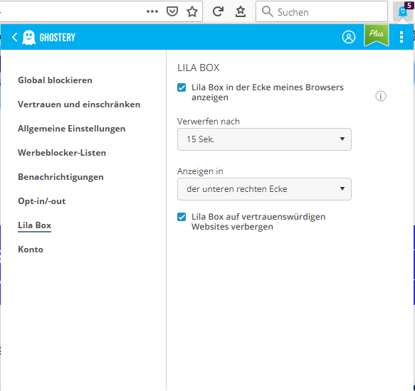 Dabei gibt es bei Ghostery sogar in den Einstellungen einen Punkt der "Lila Box" heißt