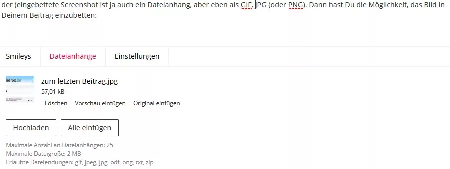 der (eingebettete Screenshot ist ja auch ein Dateianhang, aber eben als GIF, JPG oder PNG. Dann hast Du die Möglichkeit, das Bild in Deinem Beitrag (als Vorschau oder im Original) einzubetten: