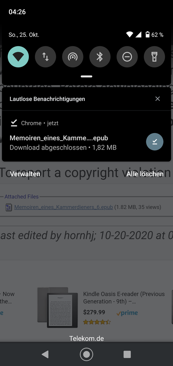 Nach einem erneuten Versuch mit dem Firefox war die mit G-Chrome heruntergeladene Datei wieder aus dem Download-Ordner verschwunden. Ich lud sie dann nochmal mit G-Chrome herunter, verschob sie auf die SD-Karte und konnte sie problemlos mit meiner E-Book-App öffnen.