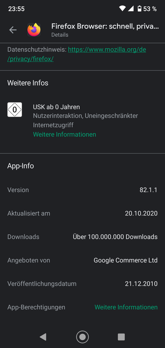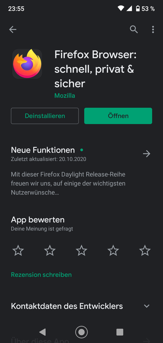 Dass der Firefox Daylight auf Google Play außer in "meiner" aktuellen Version 82.1.1 außerdem noch in der Version 81.1.5 verfügbar ist, leuchtet mir gerade nicht ein. Ist die 82.1.1 eine Beta-Version? Davon steht aber nirgends was auf meinen Screenshots und ich habe ursprünglich auch definitiv keine Beta installiert. Und .DeJaVu schreibt was von einer aktuellen 82.1.5... Irgendwie verwirrend.