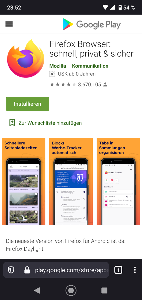 Gehe ich hingegen über die Mozilla-Downloadseite und folge dem Google-Play-Link, führt der mich zu einer anderen Version mit dem Button "Installieren"