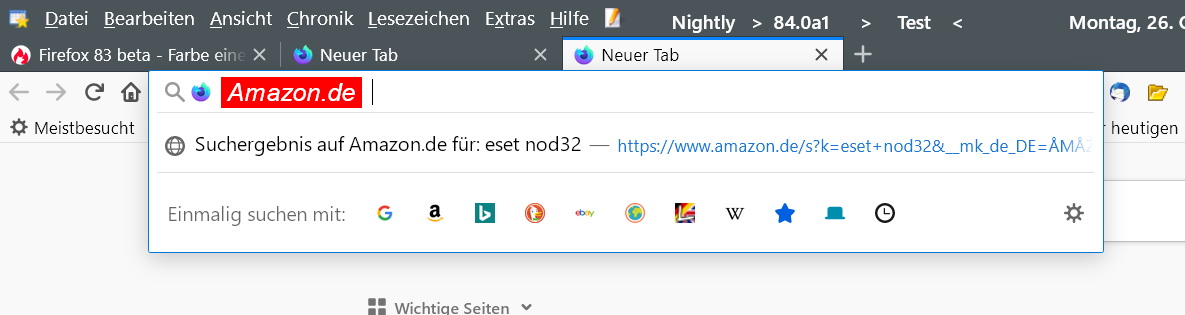 Seit dem Update auf Firefox 83 beta taucht in der URL-Leiste beim Suchen mit anderen Suchmaschinen nicht nur das Favicon der Suchmaschine auf, sondern auch ein blaues Feld mit dem Namen eben jener, siehe Screenshot. Ich würde gerne die Farben ändern, also Font, Hintergrundfarbe und Rahmen. Hat jemand den CSS-Code dafür?