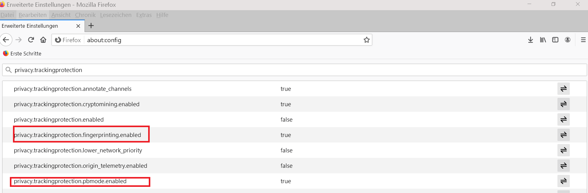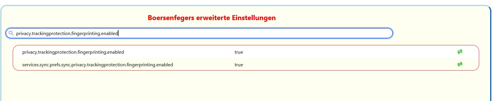 true respektive false ist der Wert. Das andere ist der Schlüssel oder meinetwegen der Name der Einstellung. Wenn er sagt, dass er den Wert nicht hat, bezieht sich das, rein sprachlich betrachtet, eindeutig auf das false beim Themenersteller. Du hast also nicht den gleichen Wert bei diesen Schaltern. Und wenn man sich gegen den sprachlichen Ansatz entscheidet, hätte das, was er meint, spätestens durch den darauffolgenden Satz klar sein können, in welchem er darauf hinwies, dass die Einstellungen zurückzusetzen seien, sprich: wieder auf true zu setzen sind. Der Blödsinn in seinem Beitrag bezieht sich auf die von ihm vermutete Quelle "Privacy Handbuch", nicht auf die Existenz des Schalters. Ansonsten hätte der voherige Satz mit dem Zurücksetzen ja auch gar keinen Sinn ergeben.