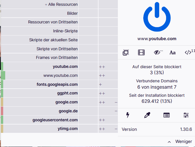 Beim Rosin-Video werden hier 18% blockiert. Was hier noch aktiv ist, ist der Enhancer für Youtube Videos (Erweiterung)